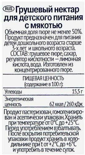 | Состав | грушевое пюре, сахар-песок, регулятор кислотности - лимонная кислота, вода. изготовлен из концентрированного пюре. перед употреблением взбалтывать. |