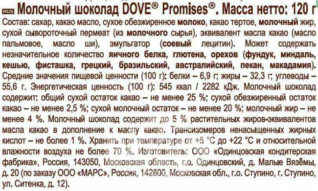 | Состав | Сахар, какао масло, сухое обезжиренное молоко, какао тертое, молочный жир, лактоза, эмульгатор (соевый лецитин), ароматизатор (ванилин). Может содержать незначительное количество яичного белка, глютена, орехов (фундук, миндаль, кешью, фисташка, грецкий, бразильский, кедровый, австралийский, пекан, макадамия) |
