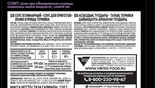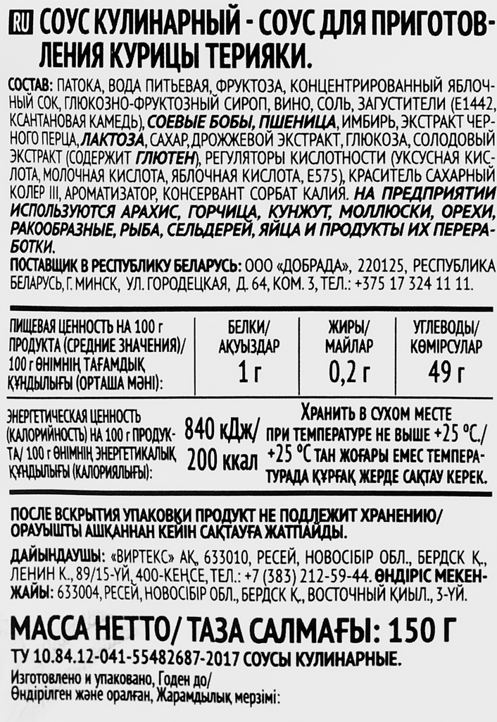 | Состав | патока, соус соевый, вода, сок яблочный концентрированный, фруктоза, вино красное, загустители - крахмал кукурузный модифицированный, камедь ксантановая; имбирь, солод, регуляторы кислотности - кислота уксусная, кислота яблочная, кислота молочная; ароматизаторы в т.ч. натуральные, консерванты - бензоат натрия, сорбат калия |