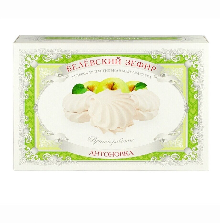 Зефир Белевский Антоновка 250г - это изысканное лакомство, которое производится по старинной технологии на основе натурального яблочного пюре. Зефир готовится вручную опытными белевскими мастерами: отборная Антоновка с ближайших ферм очищается, обваривается и перетирается в пюре, которое затем смешивают с взбитыми белками и другими ингредиентами. Консистенция у зефира легкая, воздушная, пористая; вкус сладко-сливочный, с легкой яблочной кислинкой и насыщенным ароматом свежих яблок. Упакован в контейнер с ячейками, герметичную пленку и картонную коробку. Калорийность 1 штучки - всего 53 ккал.