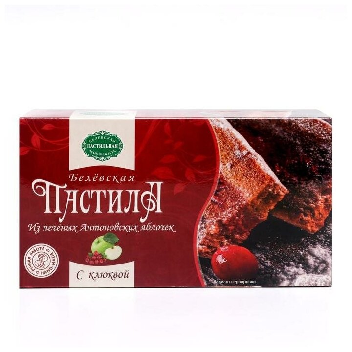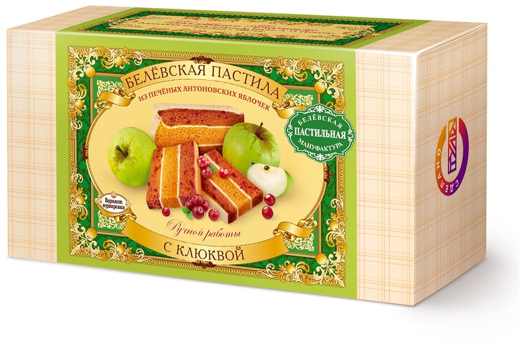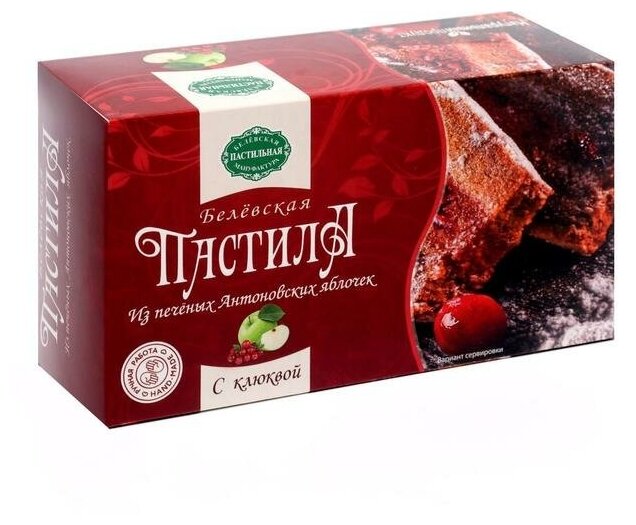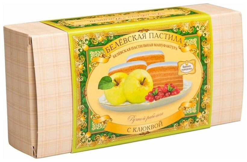 Пастила Белевская с клюквой 200г производится вручную на основе традиционного рецепта купца Амвросия Прохорова. Как и в далеком 1888 году, для ее приготовления используются только натуральные ингредиенты: яблоки сорта Антоновка, клюква, сахар и яичный белок. Душистые яблоки и спелая клюква сначала запекаются на медных противнях в дровяной печи. После остывания получившееся яблочно-ягодное пюре смешивается со взбитой меренгой. В итоге получается воздушная, ароматная и на 100% натуральная пастила без консервантов, красителей и ароматизаторов. Упакована в экологически чистый пергамент и картонную коробку.