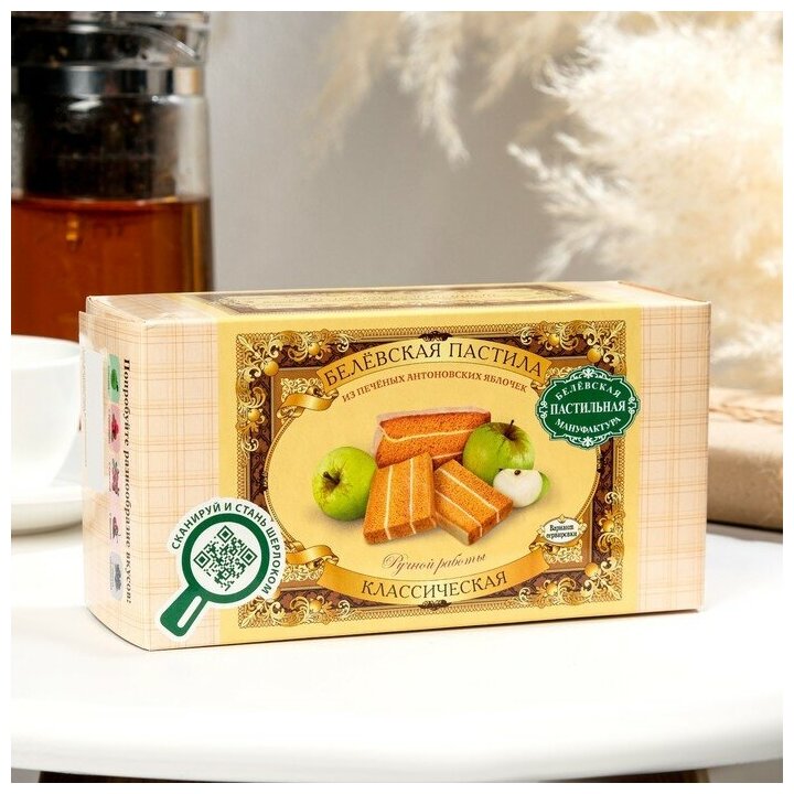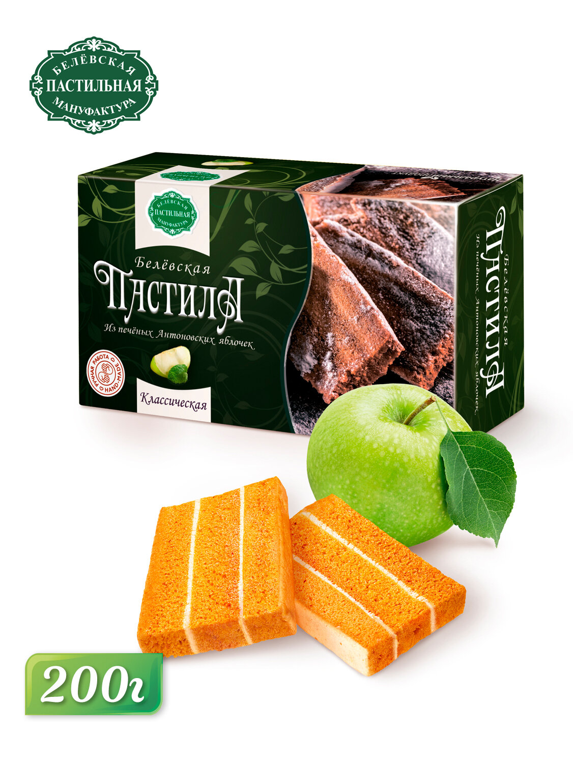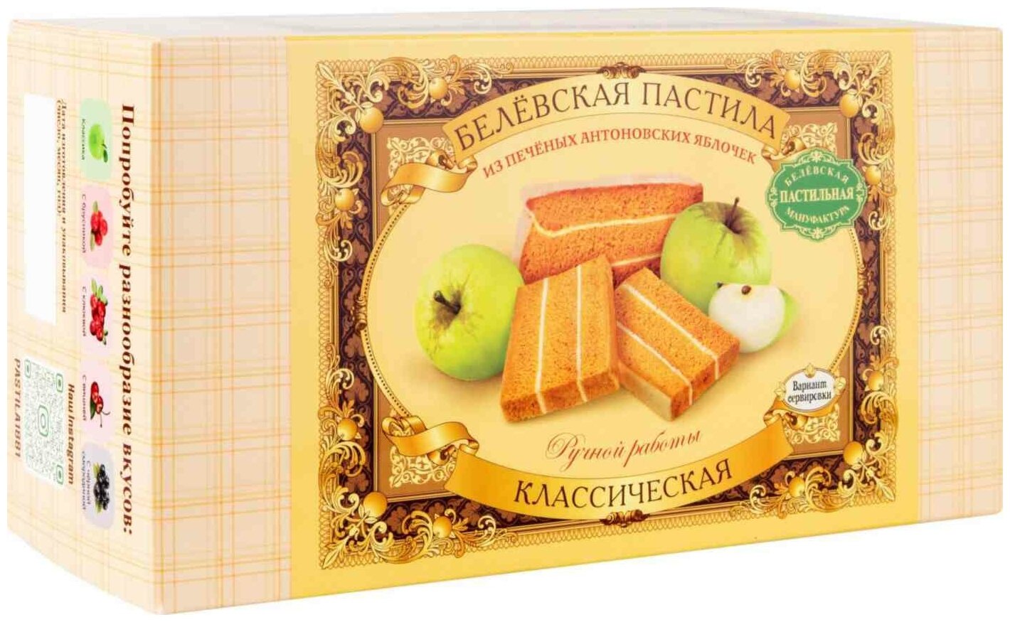 Пастила Белевская классическая 200г производится вручную по традиционному рецепту купца Амвросия Прохорова. Как и в далеком 1888 году, для ее приготовления используется всего три ингредиента: яблоки сорта Антоновка, сахар и натуральный яичный белок. Спелые душистые яблоки сначала запекаются на медных противнях в дровяной печи. После остывания получившееся яблочное пюре смешивается со взбитой меренгой. В итоге получается воздушная, ароматная и на 100% натуральная пастила без консервантов, красителей и ароматизаторов. Упакована в экологически чистый пергамент и картонную коробку.