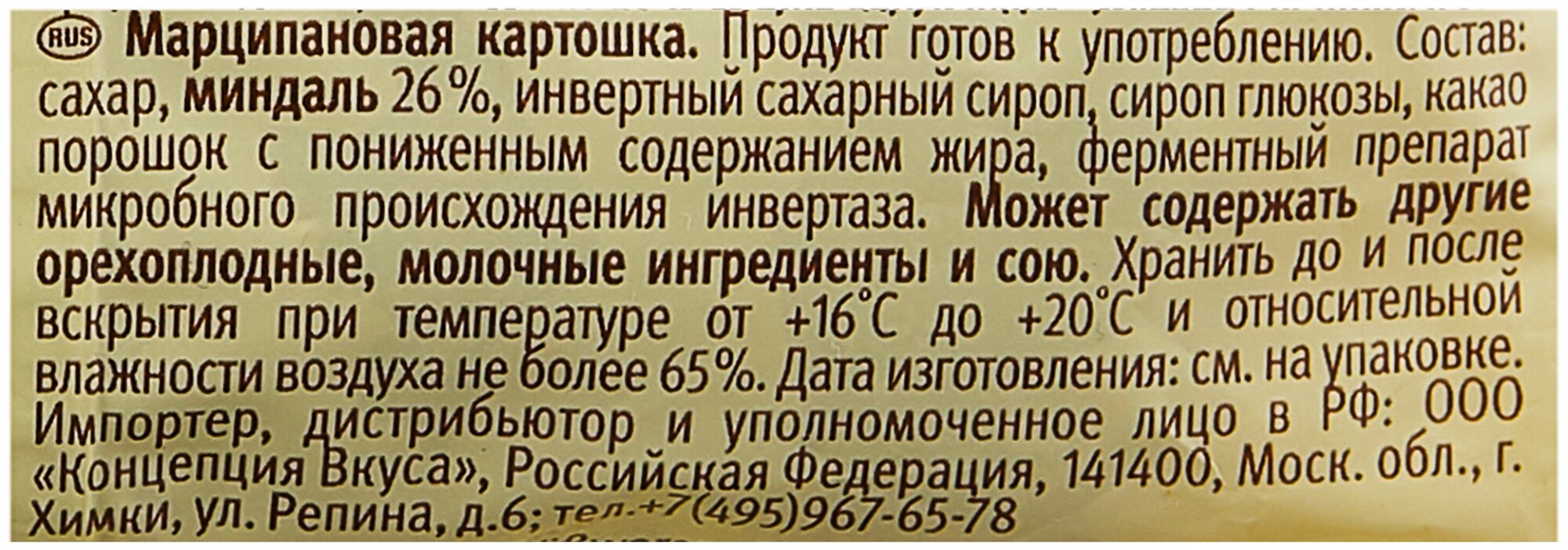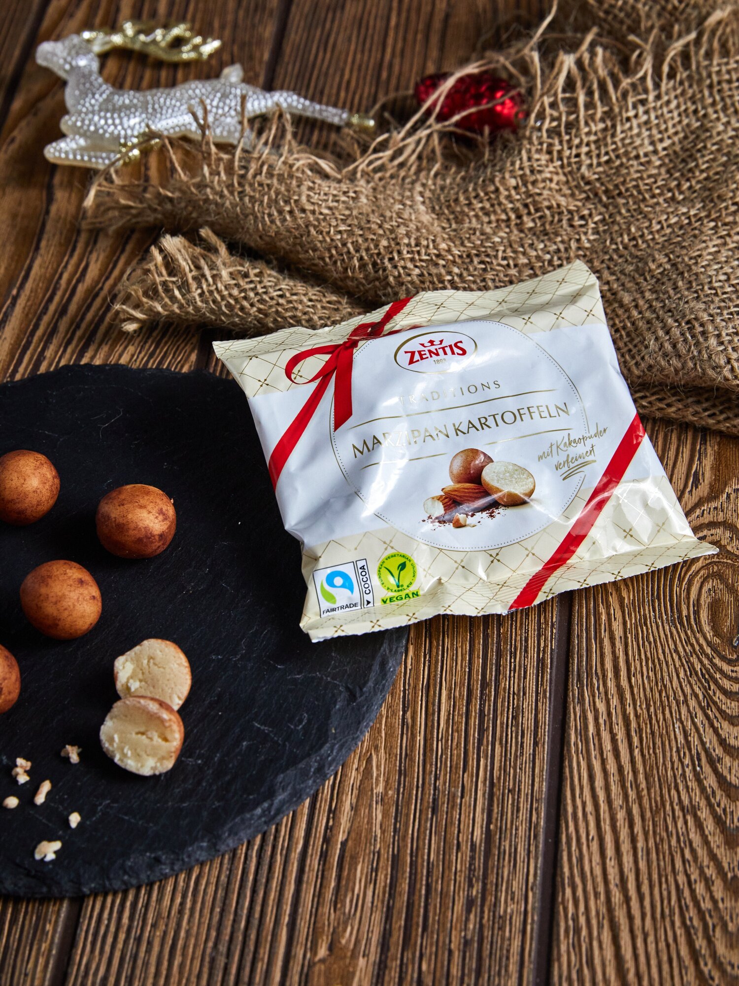 Картошка марципановая Zentis 100г - это традиционное европейское лакомство, приготовленное из отборного миндаля и сахарной пудры. Оно сформовано в виде миниатюрных клубней картофеля и припудрено сверху небольшим количеством темного какао-порошка. Марципан 50/50 имеет плотную, но мягкую консистенцию, насыщенный миндальный аромат и чистый ореховый вкус. Цельные орехи проходят минимальную переработку, поэтому марципановые продукты сохраняют всю пользу натурального миндаля и считаются одними из самых полезных десертов или сладостей к чаю.