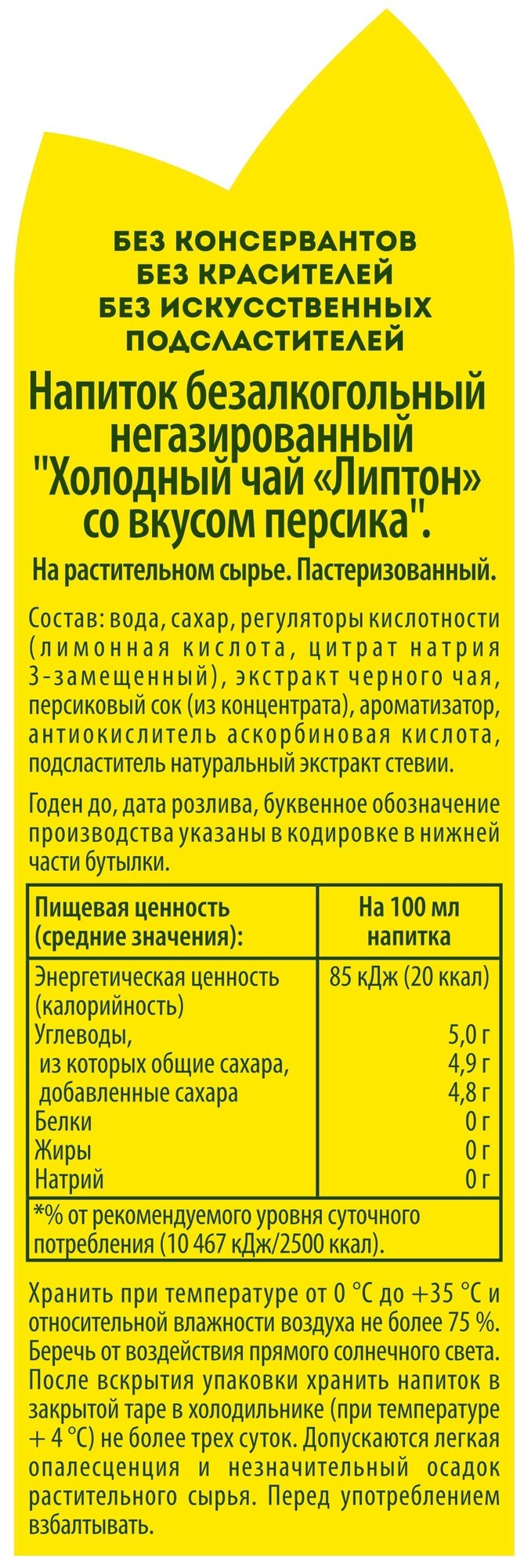 | Состав | Вода, сахар, регуляторы кислотности (лимонная кислота, цитрат натрия З-замещенный), экстракт черного чая, персиковый сок (из концентрата), ароматизатор, антиокислитель аскорбиновая кислота, подсластитель натуральный экстракт стевии |