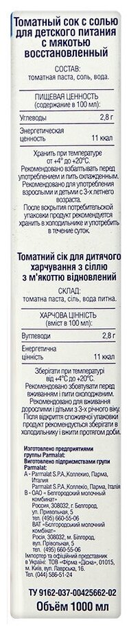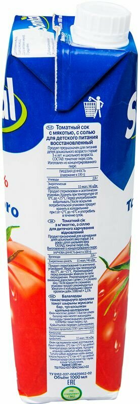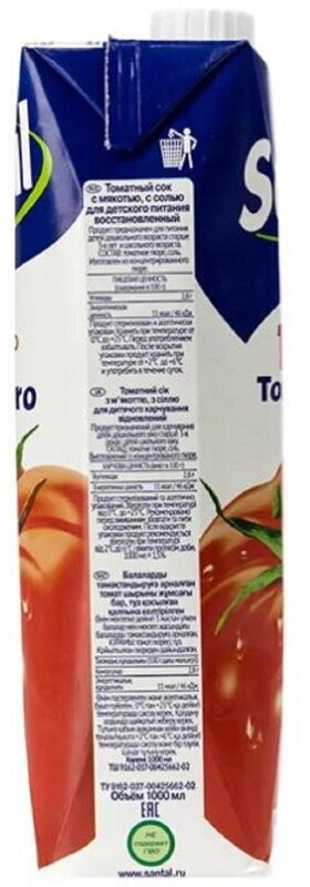 Сок Santal томатный 100% 1 л. Изготовлен из концентрированного сока. Сок томатный для детского питания. Рекомендовано для употребления взрослыми и детьми с 2-х лет в организованных детских учреждениях. Состав: восстановленный из концентрированного сока с добавлением соли не более 0,3%, без добавления консервантов и красителей Объем: 1 л Вкус: томатный Тип упаковки: картонная Пищевая ценность: углеводы - 2.8 г; Энергетическая ценность: 11 ккал Условия хранения: При температуре 0°С до +25°С. После вскрытия упаковки хранить при температуре +4(+2)°С