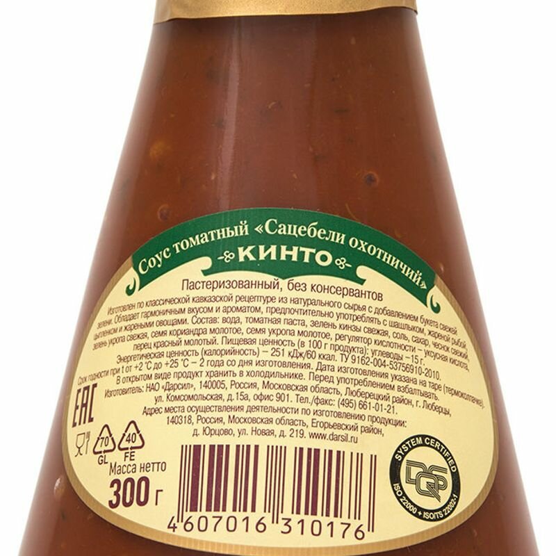 Приготовленный по традиционному рецепту Соус Кинто Сацебели Охотничий 300г порадует всех любителей кавказской кухни своими пряными ароматами и натуральным, в меру острым вкусом! Помимо пасты, сделанной из отборных спелых помидоров, в его состав входит чеснок, свежая зелень укропа и кинзы, молотые семена кориандра. Он прекрасно сочетается с мясными блюдами, шашлыком, курицей, картофелем, печеными овощами и рыбой. Продукт не содержит красителей, консервантов, ароматизаторов и других искусственных добавок.