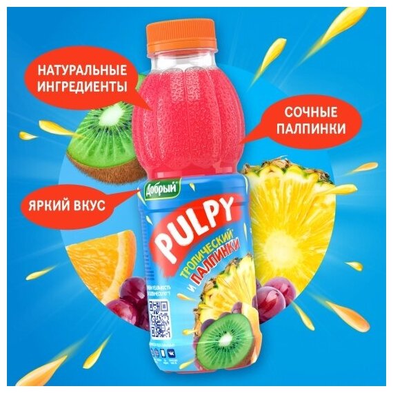 Напиток сокосодержащий Добрый Палпи Тропический 450мл - это освежающий коктейль из сока апельсина, киви, ананаса, яблока, мандарина, красного винограда, бананового пюре, артезианской воды и сочных палпинок - натуральной мякоти цитрусовых. Чтобы наслаждаться его богатым экзотическим вкусом и палпинками в каждом глотке, перед употреблением встряхните бутылку. Продукция бренда дважды становилась обладателем премии "Товар года" (в 2015 и в 2016 году). Не содержит консервантов и подходит для питания детей старше 3 лет. Упакован в стилизованную под кожуру апельсина пластиковую бутылку с винтовой крышкой.