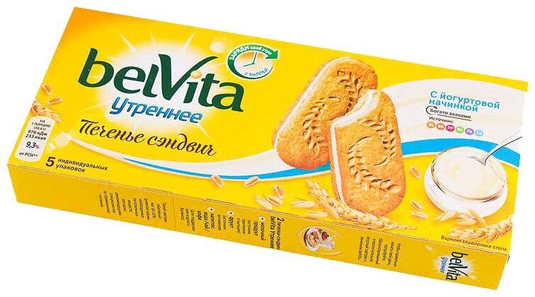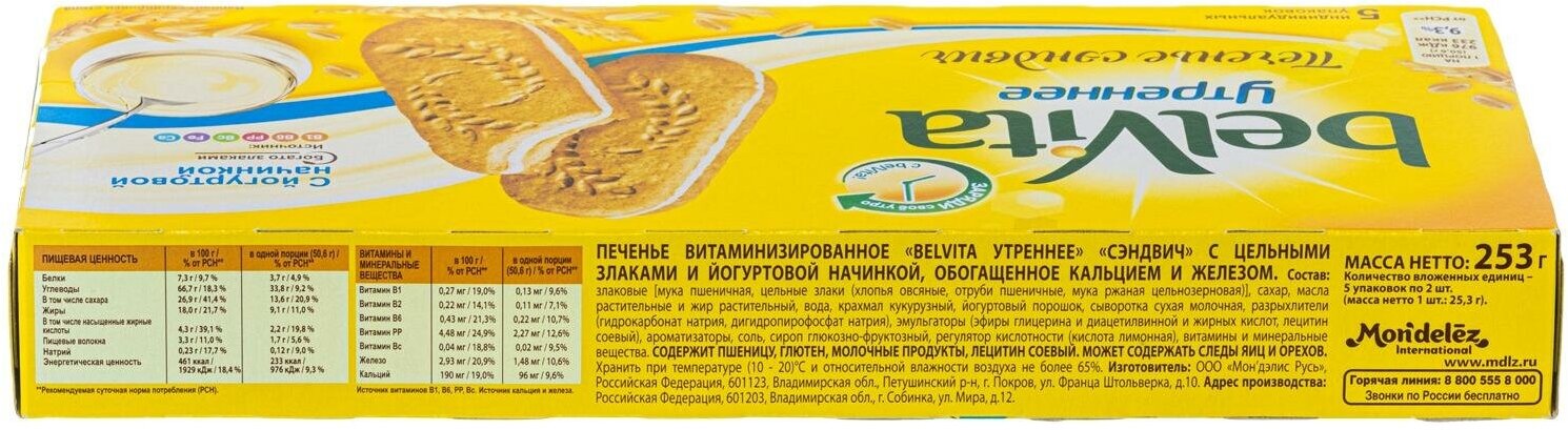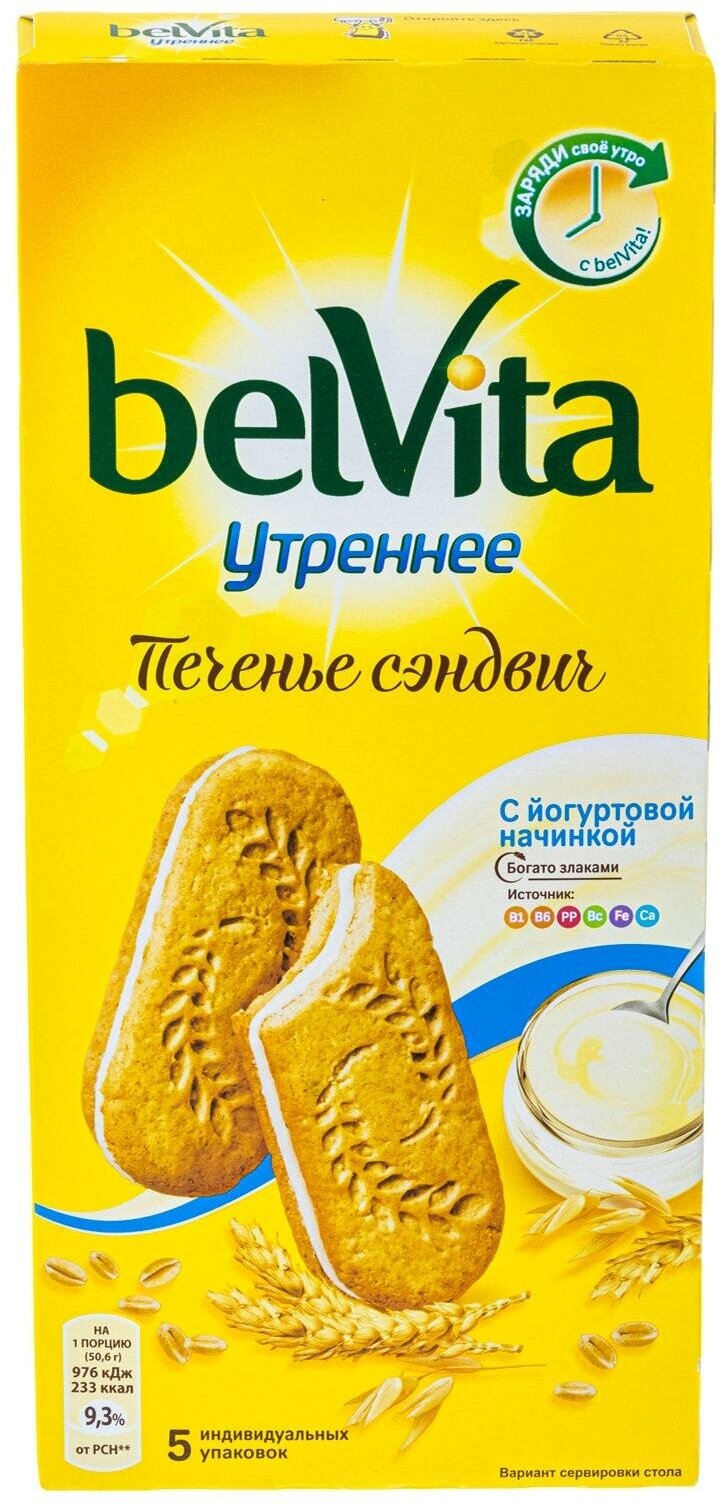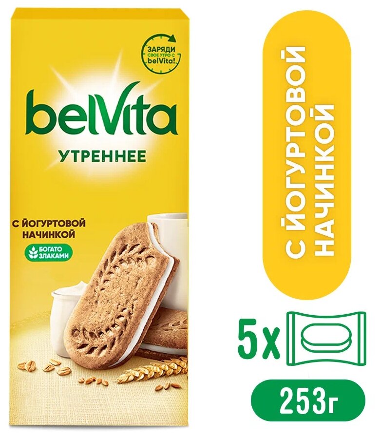 Печенье-сэндвич Belvita Утреннее со злаками и йогуртовой начинкой 253г создано специально для вкусных, сытных и еще более полезных завтраков. Сбалансированный состав с йогуртом, обогащенный витаминно-минеральным комплексом, а также злаковыми хлопьями и отрубями, подарит вам энергию и наладит хорошее пищеварение с самого утра. Печенья легко ломаются и буквально тают во рту. Они подходят и для взрослых завтраков с кофе, и для детских - с чаем, соком или кисломолочными продуктами. В коробке - 5 герметичных пакетиков по 2 штучки в каждом. Такие порционные пакетики удобно брать с собой в дорогу или на работу, давать ребенку в школу или на прогулку.
