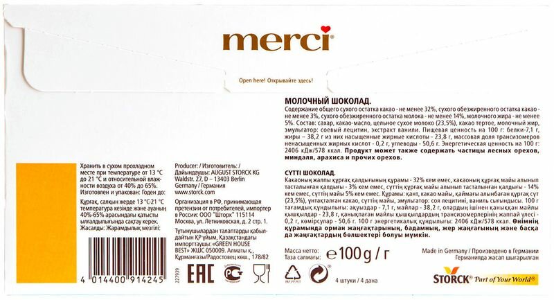 Состав: сахар, какао-масло, молоко сухое цельное, какао тертое, молочный жир, эмульгатор соевый лецитин, экстракт ванили. Молочный шоколад содержит: массовая доля общего сухого остатка какао - не менее 32%, массовая доля сухого обезжиренного остатка какао - не менее 3%, массовая доля сухого общего остатка молока - не менее 18%, массовая доля молочного жира - не менее 5%