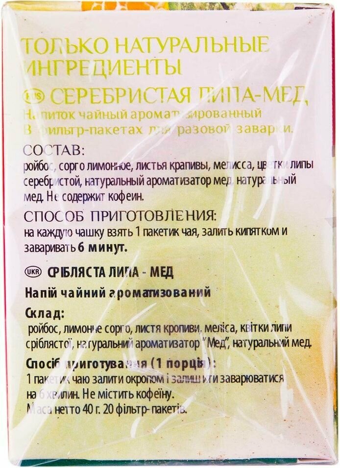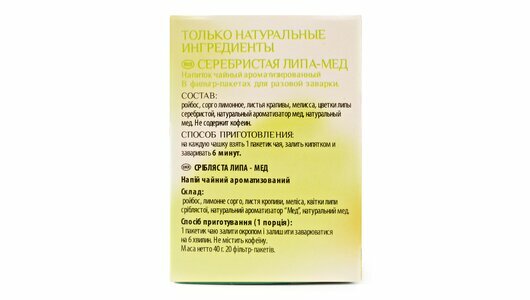 | Состав | Ройбос, сорго лимонное, листья крапивы, мелисса, цветки липы серебристой, натуральный ароматизатор мед, натуральный мед |