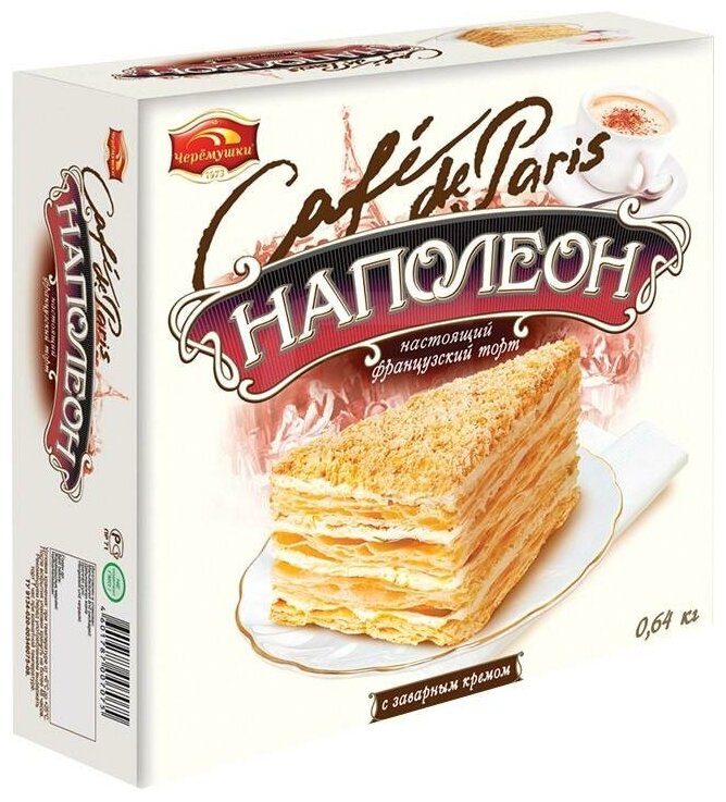 Торт Черемушки Наполеон Cafe de Paris 640г - это настоящая классика французской выпечки! Несколько коржей из воздушного слоеного теста пропитаны нежнейшим заварным кремом, а готовый торт присыпан сверху хрустящей слоеной крошкой. Изделие упаковано в пластиковую подложку, поэтому не деформируется при транспортировке. Герметичная пленка сохраняет его свежим и мягким в течение всего срока годности. Можно хранить при комнатной температуре, после вскрытия упаковки следует употребить в течение 48 часов.