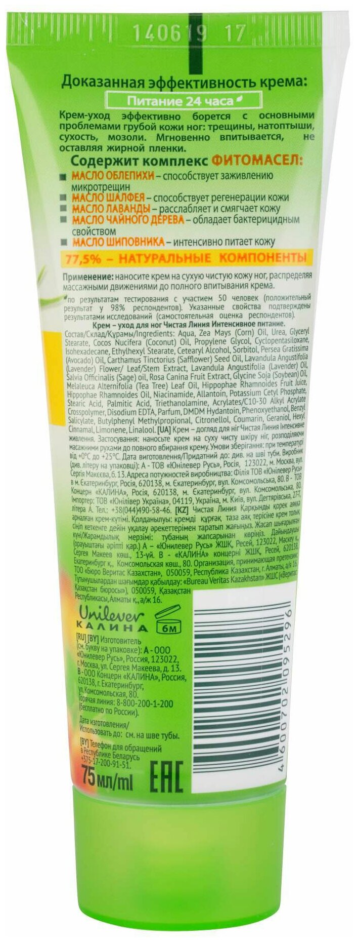 Крем-уход для ног Чистая Линия Интенсивное питание 75мл с комплексом фитомасел решит основные проблемы огрубевшей кожи ног. Облепиха ускоряет заживление ранок и микротрещин, шалфей обладает противовоспалительными и антибактериальными свойствами, способствует восстановлению клеток, лаванда увлажняет и смягчает, чайное дерево устраняет покраснения и воспаления, а шиповник обеспечивает усиленное питание кожи. Крем мгновенно впитывается и не оставляет неприятной жирной пленки. Регулярное применение этого продукта позволит вашим ножкам забыть о том, что такое натоптыши, мозоли, трещины и сухость.