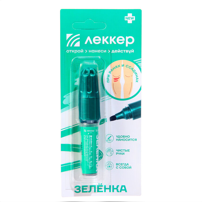 Раствор зеленки Леккер 1% 5мл - незаменимое средство в домашней аптечке, представляющее собой твердый пористый стержень, пропитанный спиртовым раствором бриллиантового зеленого. Он не пачкает руки, им удобно пользоваться не только дома, но и в путешествии. Леккер предназначен для наружного применения, он обладает дезинфицирующим, антисептическим и антибактериальным свойствами, используется для обработки послеоперационных швов, ссадин и порезов, кожи при ветрянке, предохраняет раны от возникновения инфекций. Следует хранить при комнатной температуре в защищенном от света месте. Проследите, чтобы колпачок был плотно закрыт.