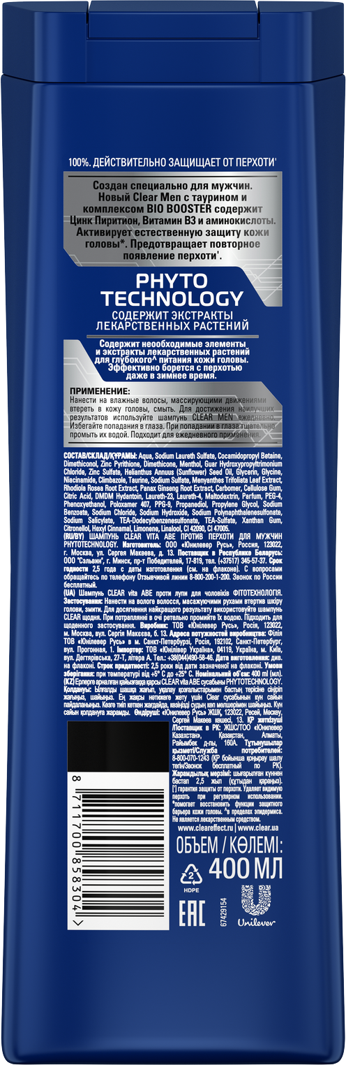 Шампунь для волос Clear Men Против перхоти Phytotechnology 400мл Unilever