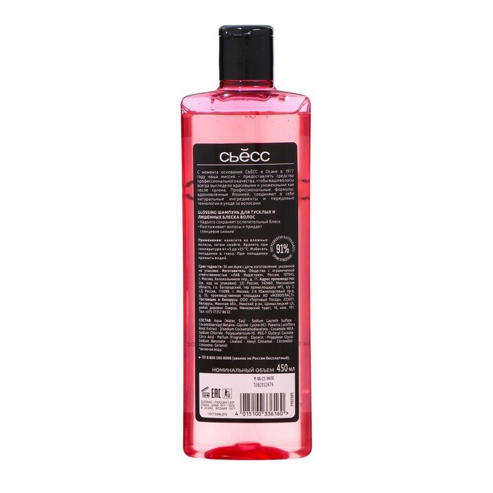 | Химический состав | Aqua, Sodium Laureth Sulfate, Cocamidopropyl Betaine, Sodium Chloride, Malus Domestica Fruit Cell Culture Extract, Panthenol, Hydrolyzed Keratin, Prunus Armeniaca Kernel Oil, Disodium Cocoamphodiacetate, Glycol Distearate, Citric Acid, Sodium Benzoate, Cocamide MEA, Dimethicone, PEG-7 Glyceryl Cocoate, Parfum, Laureth-4, PEG-40 Hydrogenated Castor Oil, Guar Hydroxypropyltrimonium Chloride, Hydrogenated Castor Oil, Linalool, Mica, Laureth-23, Glycerin, Geraniol, Butylphenyl Methylpropional, Benzyl Alcohol, Hexyl Cinnamal, Propylene Glycol, CI 77891, CI 17200, CI 42090 |