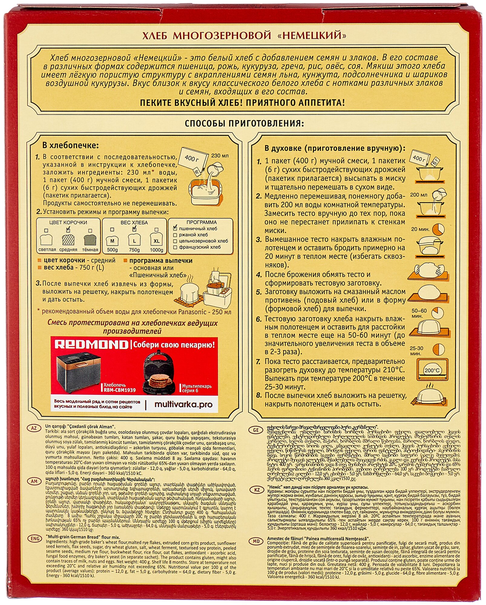 Состав: Мука пшеничная хлебопекарная высшего сорта, хлопья ржаные осолодованные, продукт экструдированных круп кукурузный крупа кукурузная, ядра семян подсолнечника, семена льна, сахар-песок, клейковина пшеничная сухая, соль поваренная пищевая, белок соевый, эмульгатор - лецитин соевый, семена кунжута, мука ржаная хлебопекарная обдирная, мука гречневая, мука рисовая, хлопья овсяные, антиокислитель - аскорбиновая кислота, дрожжи хлебопекарные сухие в отдельном пакетике. Продукт содержит глютен, может содержать следы молочных, яичных продуктов и кунжута