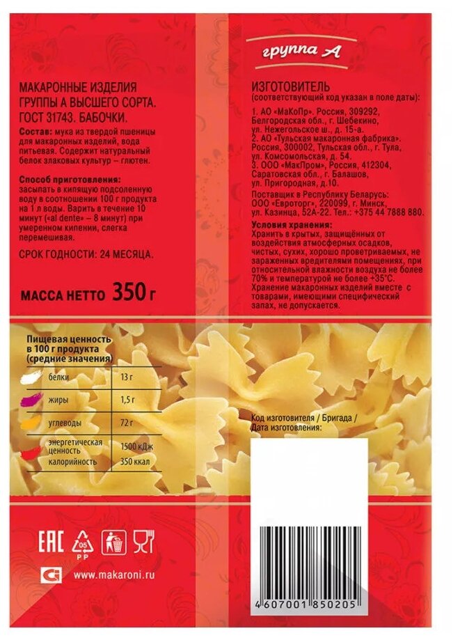 | Производитель | 1. ПАО "МаКоПр"<br/>2. АО "Тульская макаронная фабрика"<br/>3. ООО "МакПром"<br/><br/>Соответствующий код производителя указан в поле даты. |