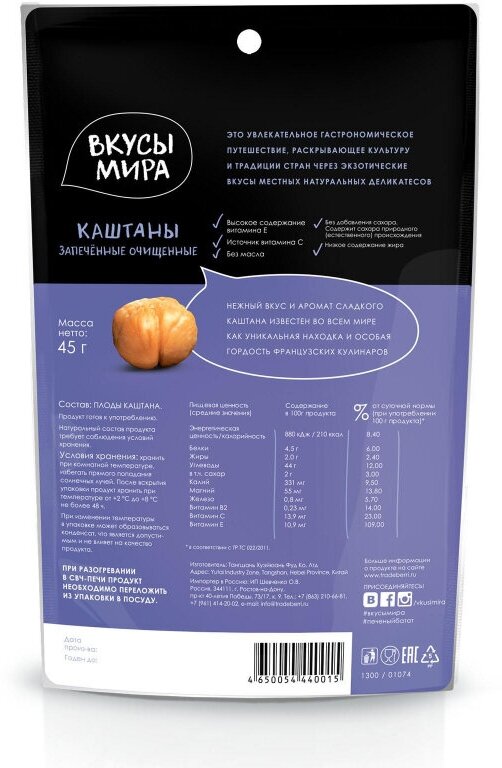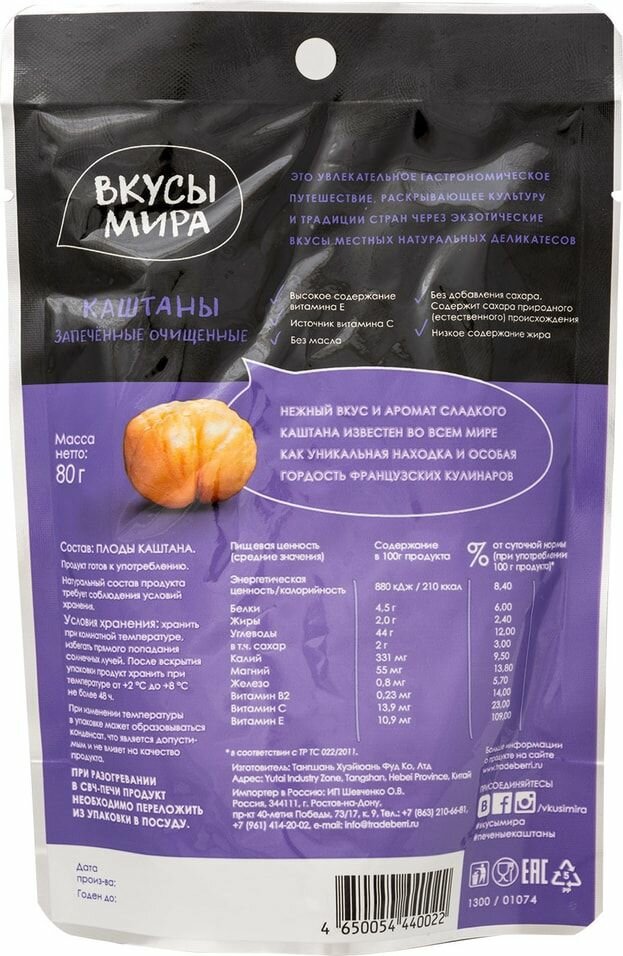 Каштаны Вкусы Мира запеченные очищенные 80г - это натуральный и полезный продукт, который познакомит вас с гастрономическими традициями французской кухни. Запеченные на огне каштаны имеют нежную консистенцию и приятный, чуть сладковатый вкус. В ядрах содержится много витамина С и Е, и, по сравнению с другими орехами, совсем мало жира (всего 2%). Вкусные и сытные каштаны станут прекрасным перекусом в течение дня. Продукт не содержит сахара, масла, консервантов и искусственных добавок. Подходит для вегетарианского, постного и диетического питания. Можно разогреть в микроволновой печи (без упаковки).