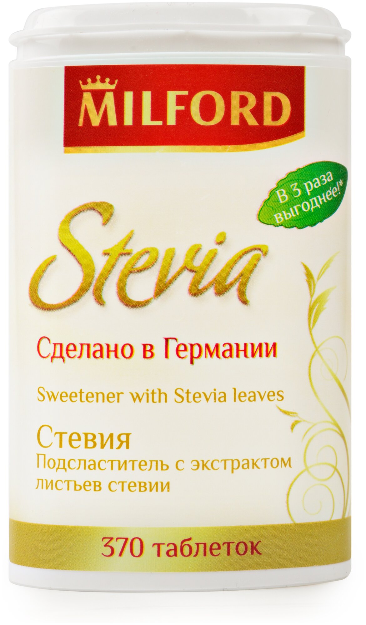 Заменитель сахара Milford с экстрактом листьев стевии 6.2г - это подсластитель, сделанный на основе южноамериканского растения Stevia. Оно имеет практически нулевую калорийность, а его листья во много раз слаще обычного белого сахара. Производится в Германии и предназначен для людей, которым требуется сократить или исключить сахар из рациона. Одна таблетка равна по сладости одному кусочку рафинада или одной чайной ложке сахара-песка. Суточная норма рассчитывается, исходя из веса человека (0.26 таблетки на 1 кг). Хорошо растворяются как в горячих, так и в холодных напитках. Компактный пластиковый дозатор позволяет за одно нажатие извлечь одну таблетку.