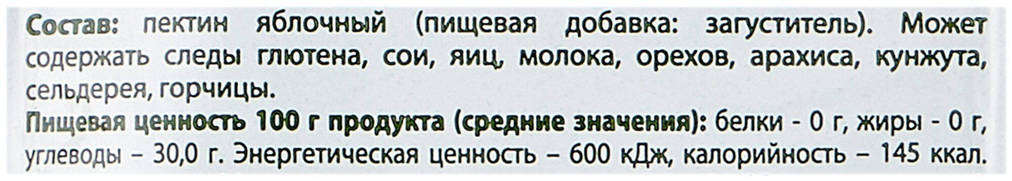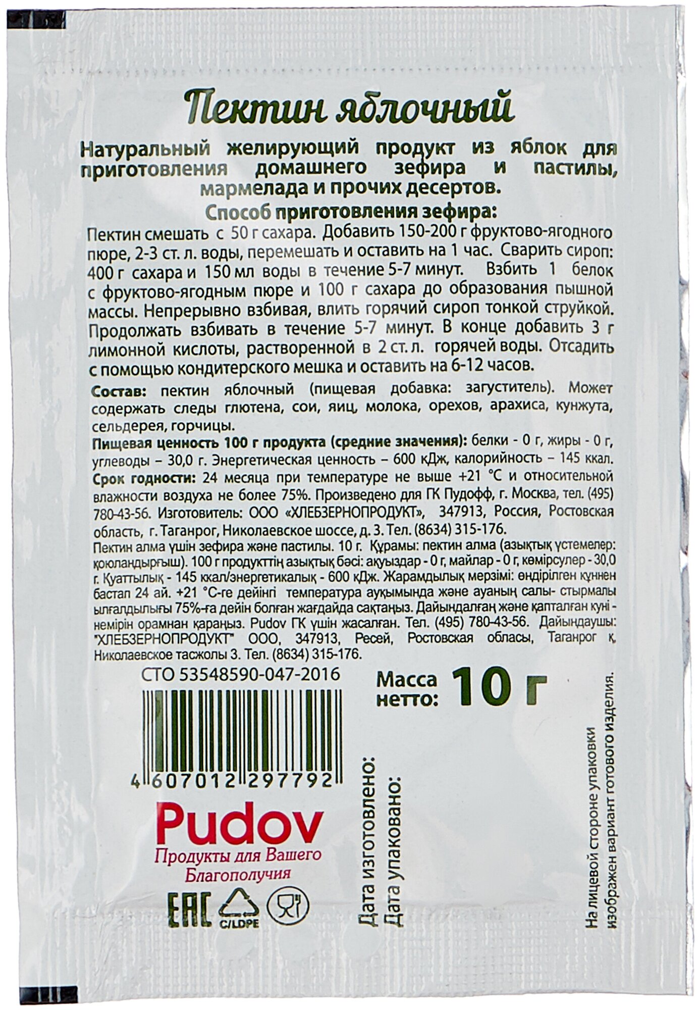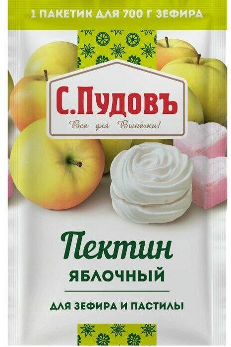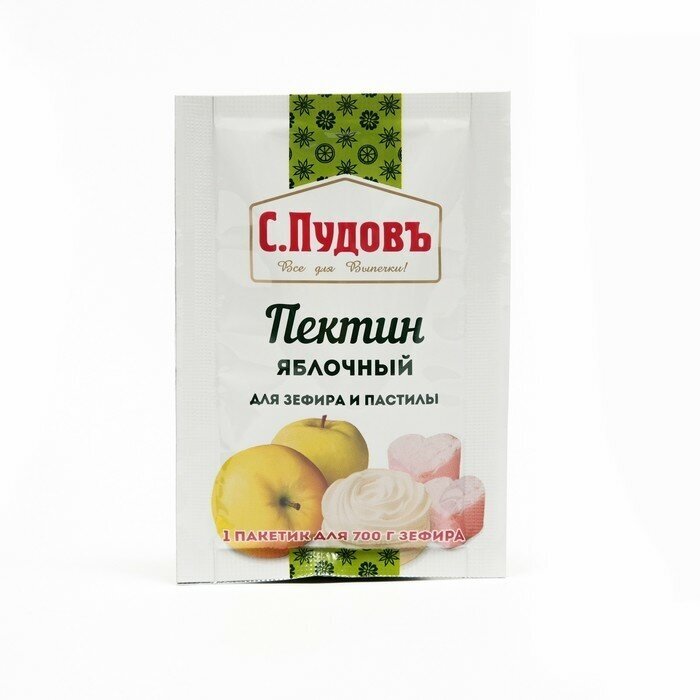 Пектин С.Пудовъ Яблочный для зефира и пастилы 10г - незаменимый ингредиент для приготовления зефира, пастилы, мармелада, джемов и других кондитерских изделий. Это натуральный загуститель, полученный из яблок, поэтому его можно употреблять и вегетарианцам, и людям, соблюдающим посты. Добавление пектина сокращает время приготовления варенья (фрукты и ягоды при этом подвергаются меньшей тепловой обработке и сохраняют больше полезных веществ). Пектин обладает также рядом целебных свойств: он благотворно влияет на работу пищеварительной системы, выводит токсины и лишний холестерин.