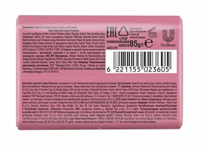 | Химический состав | Sodium Palmate, Sodium Stearate, Sodium Palm Kernelate, Aqua, Glycerin, Parfum, Palm Kernel Acid, Sodium Chloride, Tetrasodium EDTA, Etidronic Acid, Benzyl Alcohol, Benzyl Salicylate, Butylphenyl Methylpropional, Citronellol, Coumarin, Geranoil, Hexyl Cinnamal, Limonene, Linalool, Cl 12490, Cl 74160, Cl 77891 |