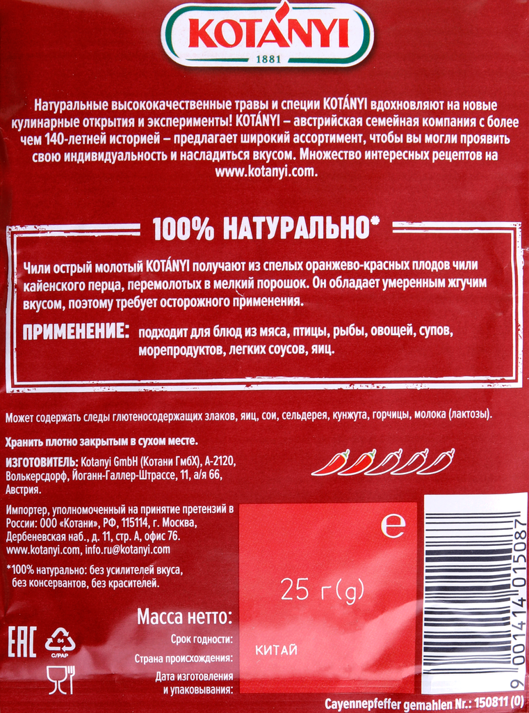| Состав | перец чили кайенский молотый |
