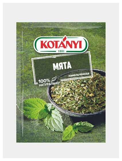 Мята Kotanyi измельченная 9г – 100% натуральная приправа, обладающая приятным ментоловым вкусом и превосходным освежающим ароматом. Производится из высококачественного сырья, которое проходит тщательный отбор, промывается, бережно высушивается и измельчается. Мята богата эфирными маслами, калием и витамином С. Она широко используется в официальной и народной медицине, а также в кулинарии. Ее можно добавлять в блюда из баранины, соусы, разнообразные напитки (к примеру, в пунш, чай или мохито). Продукт не содержит усилителей вкуса, консервантов и красителей. Хранить приправы рекомендуется в герметичной пластиковой, бумажной или стеклянной таре при комнатной температуре.