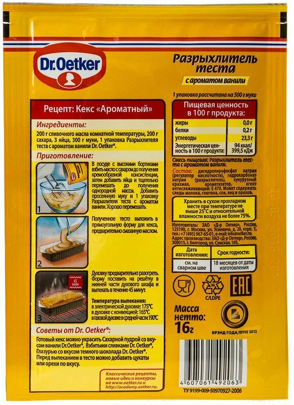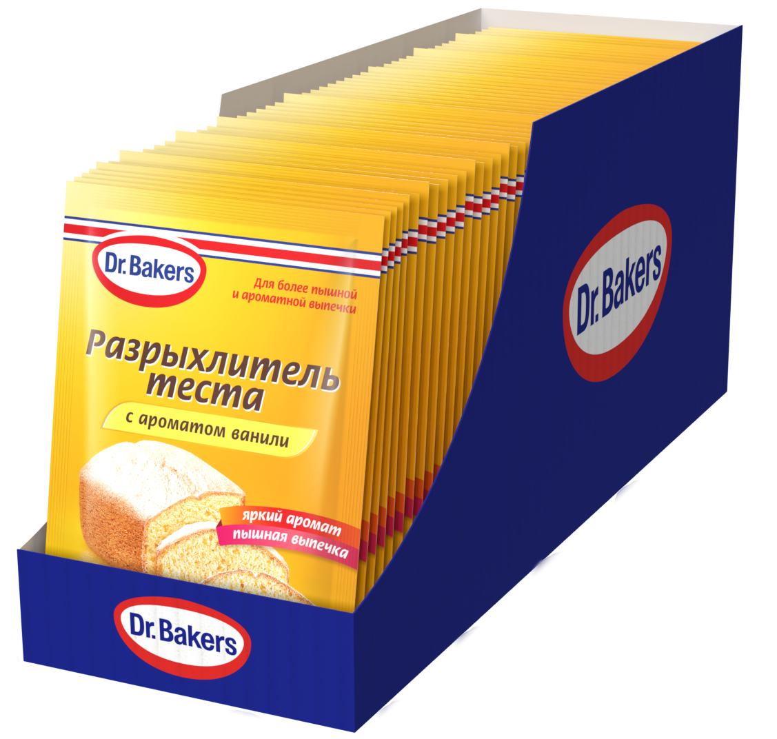 Благодаря уникальному сочетанию ингредиентов «Разрыхлитель теста с ароматом ванили» Dr.Bakers не только сделает тесто пышным и мягким, но и придаст выпечке аппетитный ванильный аромат.