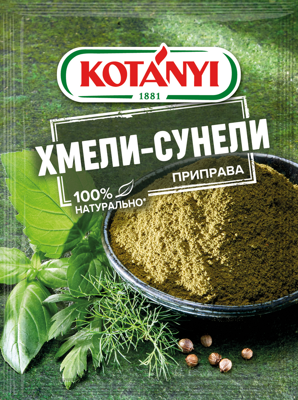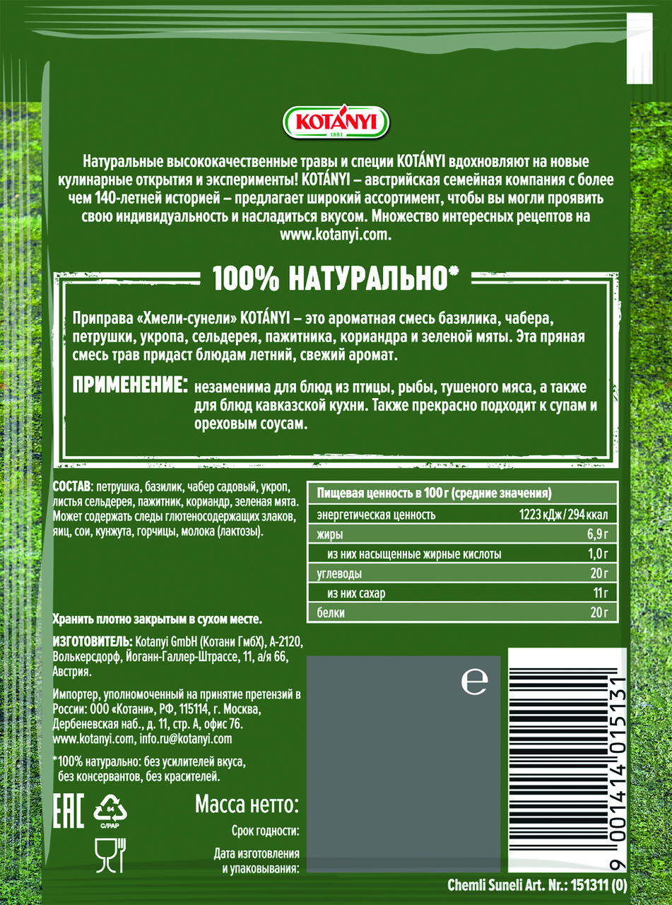 Приправа Хмели-сунели Kotanyi - это ароматная смесь базилика, чабера, кориандра и зеленой мяты. Эта пряная смесь трав придаст блюдам летний, свежий аромат. Применение: незаменима для блюд из птицы, рыбы, тушеного мяса, а также для блюд кавказской кухни. Также прекрасно подходит к супам и ореховым соусам.