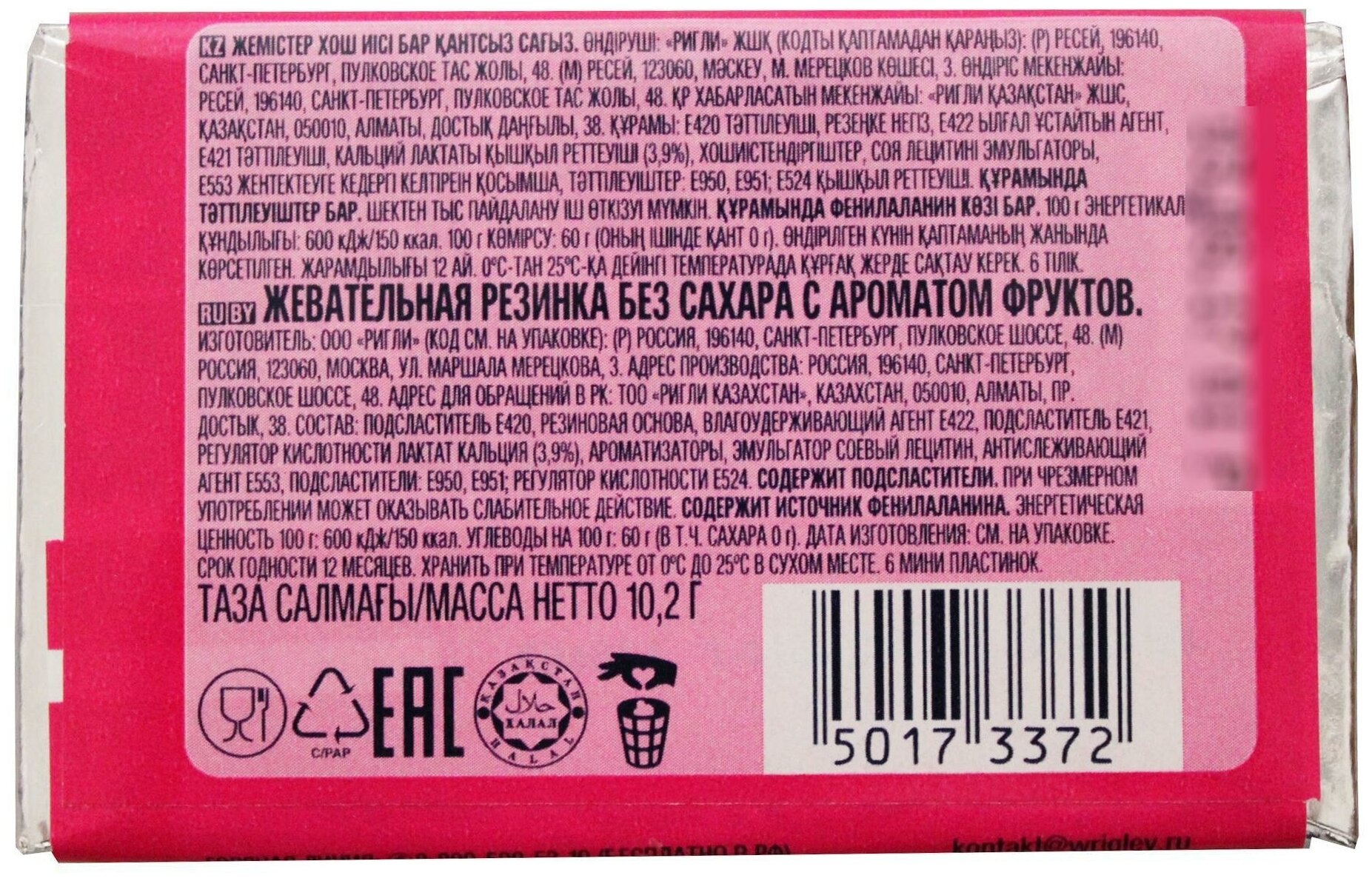 | Состав | Подсластитель Е420, резиновая основа, влагоудерживающий агент Е422, подсластитель Е421, регулятор кислотности лактат кальция (3.9%), ароматизаторы, эмульгатор соевый лецитин, подсластители |