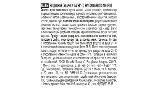 | Состав | Мука пшеничная хлебопекарная, манная крупа, растительное масло, идентичный натуральному ароматизатор (соль, сырный порошок, усилители вкуса и аромата (глутамат натрия 1-замещенный, 5-гуанилат натрия 2-замещенный), вкусоароматические вещества, порошок чеснока, порошок лука, агент антислеживающий (диоксид кремния аморфный), регулятор кислотности (лимонная кислота), специи, травы, красители (экстракт паприки, капсантин, куркумин, каротины), термический технологический проматизатор), сахар, красители (карамелизованный сахар, экстракт моркови), агент антеслеживающий (карбонат кальция) |