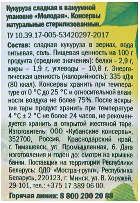 Описание товара:Кукуруза сладкая в вакуумной упаковке "Молодая". Консервы натуральные стерилизованные. ТУ 10.39.17-005-53420297-2017 Ранний урожай. Без ГМО и консервантов. Вакуумная технология упаковки сохраняет полезные свойства кукурузы без использования консервантов. Натурально сладкая, без добавления сахара и подсластителей. Природный источник клетчатки для сбалансированного питания.Состав товара:Сладкая кукуруза в зернах, вода питьевая, соль.Меры предосторожности:После вскрытия тары продукт хранить при температуре 4°C±2°C не более 24 часов, не рекомендуется хранить в открытой жестяной таре.