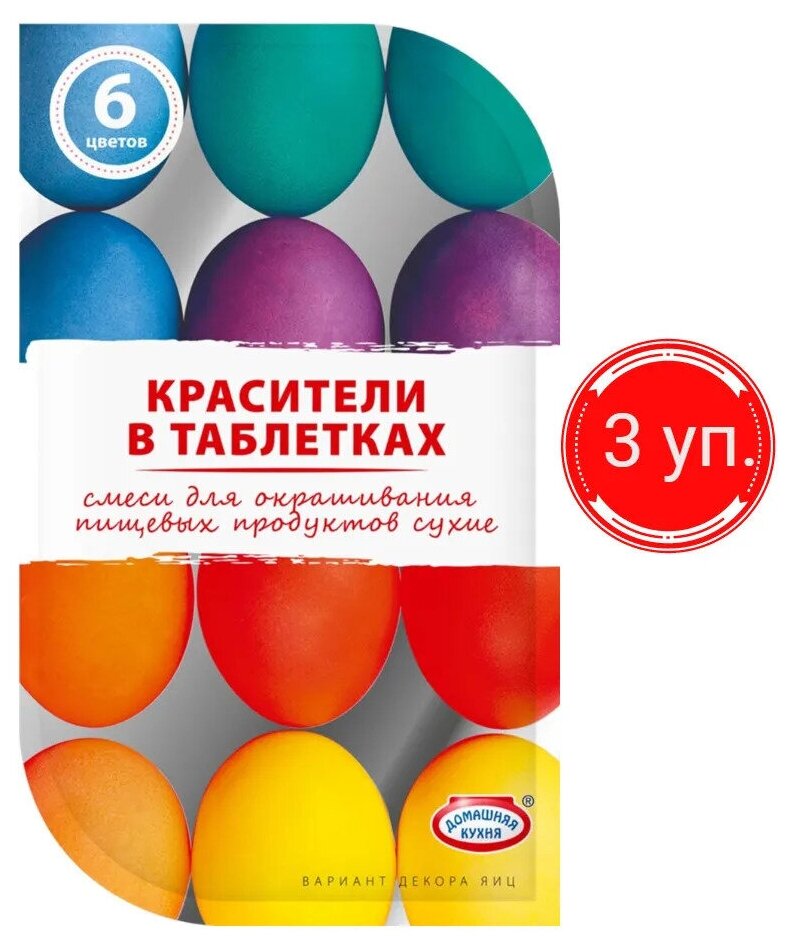 6 сухих красителей в таблетках для декорирования пасхальных яиц в классические яркие цвета - красный, синий, жёлтый, оранжевый, фиолетовый, бирюзовый. Красители необходимо только растворить в воде с уксусом.