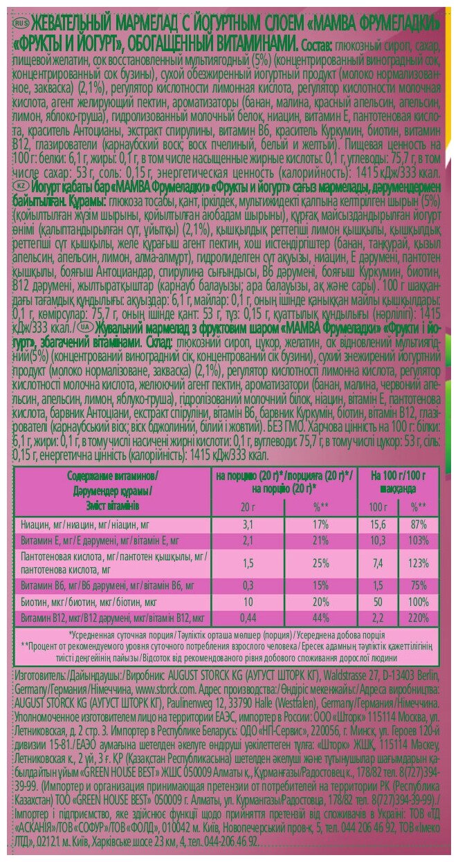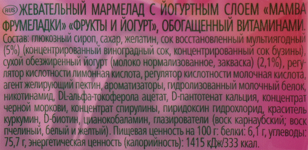 | Состав | Глюкозный сироп, сахар, пищевой желатин, сок восстановленный мультиягодный (5%) (концентрированный виноградный сок, концентрированный сок бузины), сухой обезжиренный йогурт (молоко нормализованное, закваска) (2,1%), регулятор кислотности лимонная кислота, регулятор кислотности молочная кислота, агент желирующий пектин, ароматизаторы, гидроли - зованный молочный белок, ниацин (никотинамид), витамин Е (DL-альфа-токоферола ацетат), пантотеновая кислота (D-пантотенат кальция), концентрат черной моркови, концентрат спирулины, витамин В6 (пиридоксин гидрохлорид), краситель куркумин, биотин (D-биотин), витамин В12 (цианокобаламин), глазирователи (воск карнаубский; воск пчелиный, белый и желтый). |