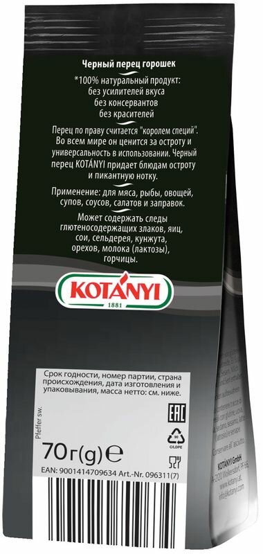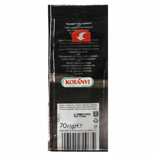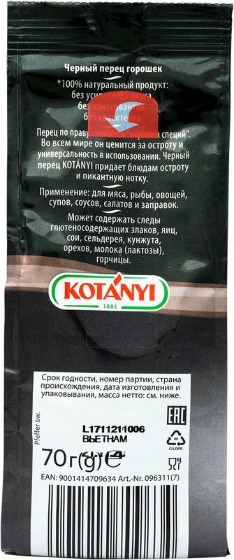 Описание товара:Перец по праву считается "королем специй". Во всем мире он ценится за остроту и универсальность в использовании. Черный перец KOTÁNYI придает блюдам остроту и пикантную нотку.Состав товара:Черный перец горошек.Меры предосторожности:Хранить плотно закрытым в сухом месте.
