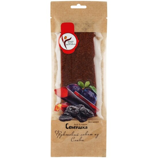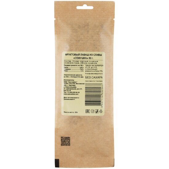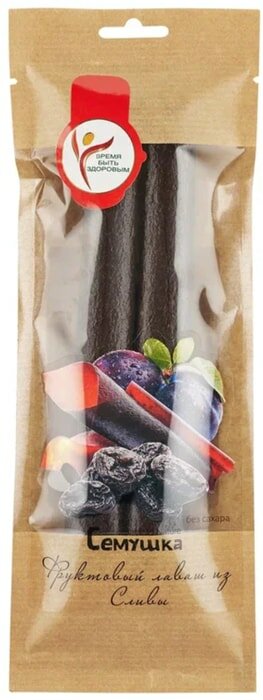 Лаваш Семушка фруктовый из сливы 80г производится по классическому армянскому рецепту из красных кисло-сладких слив (на своей родине лакомство называется тклапи - кислый лаваш). Для его приготовления спелые плоды отвариваются до пюреобразного состояния, отделяются от косточек и протираются сквозь сито. Однородная фруктовая масса выкладывается тонким слоем (2-3 мм) на противень, сушится на солнце, а затем сворачивается в трубочки. Фруктовый лаваш - это 100% натуральный и полезный продукт, в нем нет сахара (только натуральный сливовый), консервантов, искусственных добавок. Подходит для вегетарианского, постного, диетического питания.