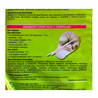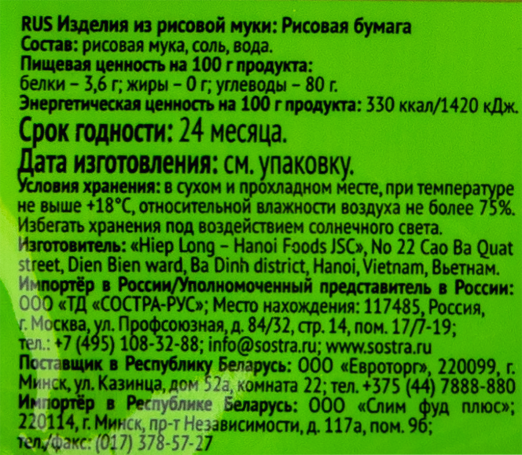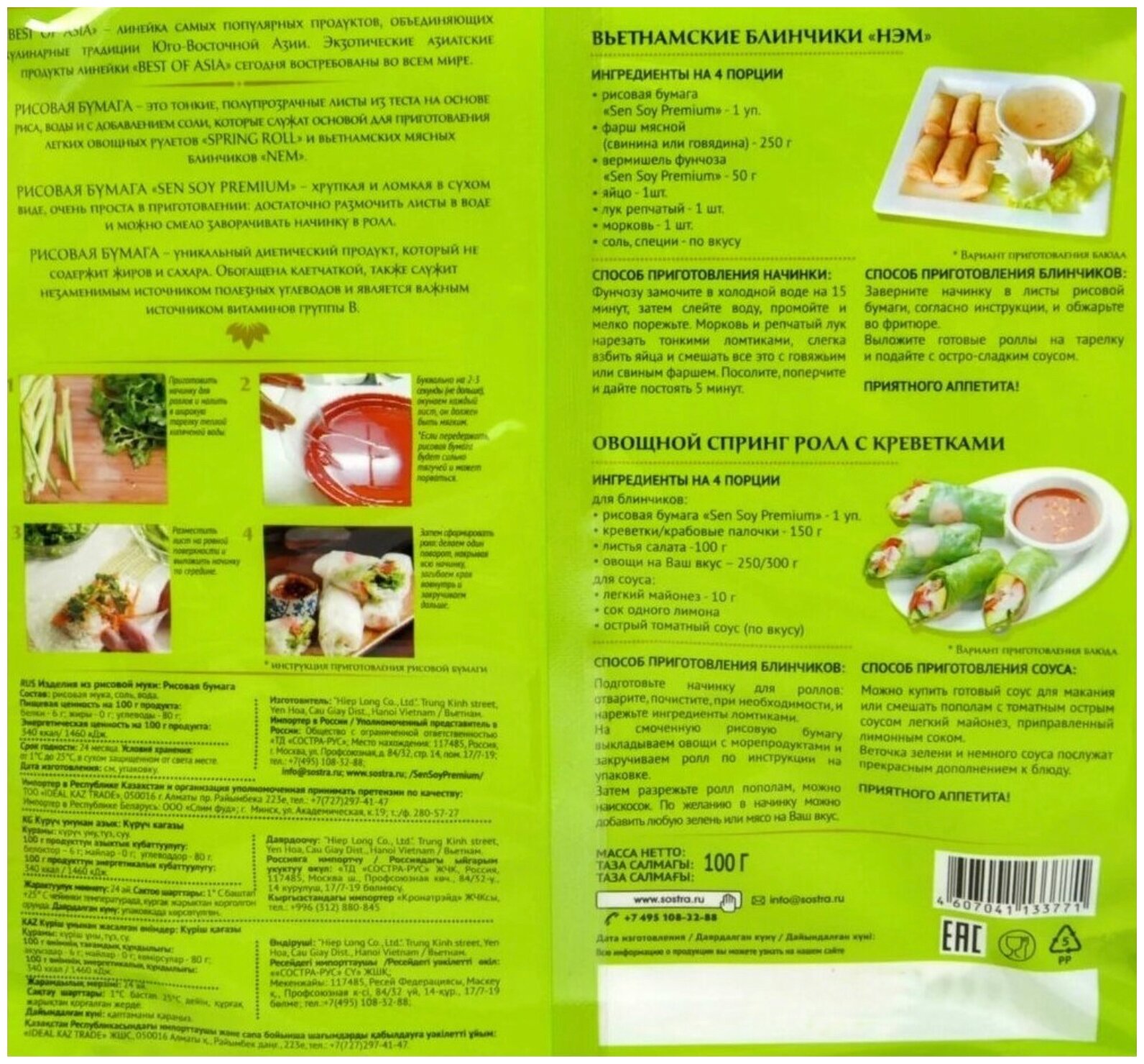 Описание товара:Рисовая бумага - это продукт, который обязательно полюбится ценителям восточной кухни. Рисовая бумага напоминает русский блинчик, в который заворачивают начинку. Но вместе с тем это тонкое полупрозрачное тесто, состоящее всего лишь из риса и воды. Этот уникальный диетический продукт не содержит жиров и сахара.Состав товара:Рисовая мука, соль, вода.