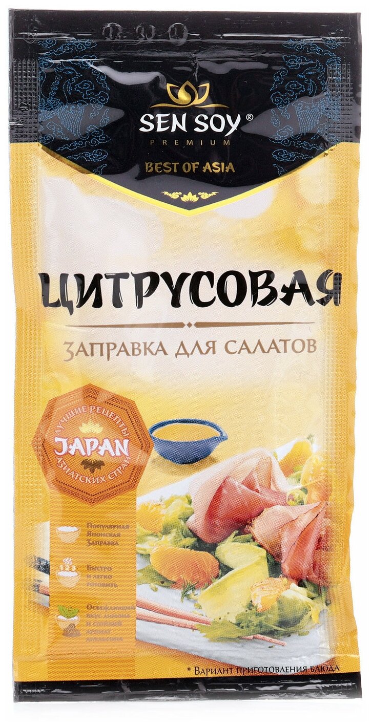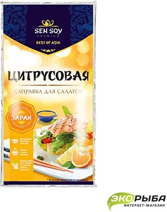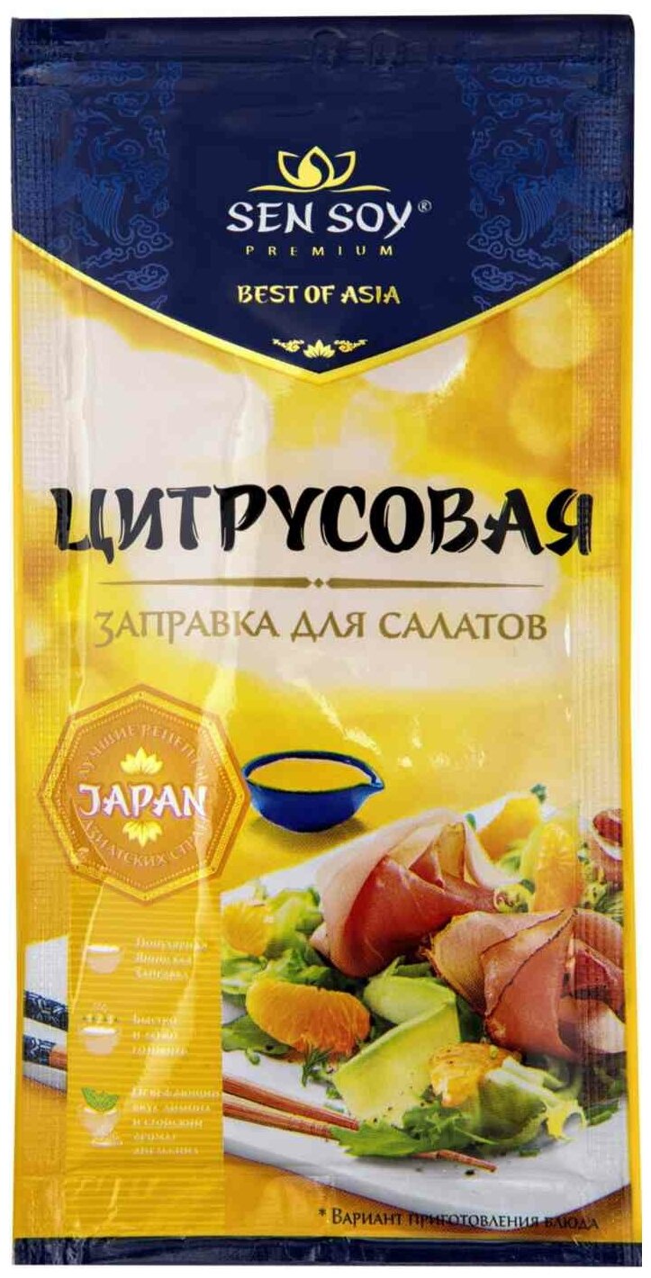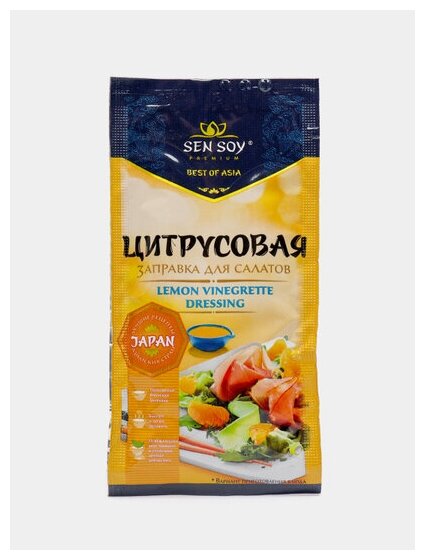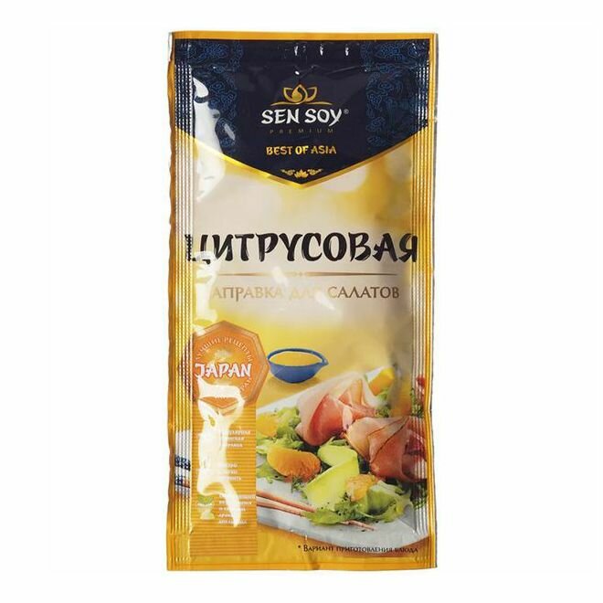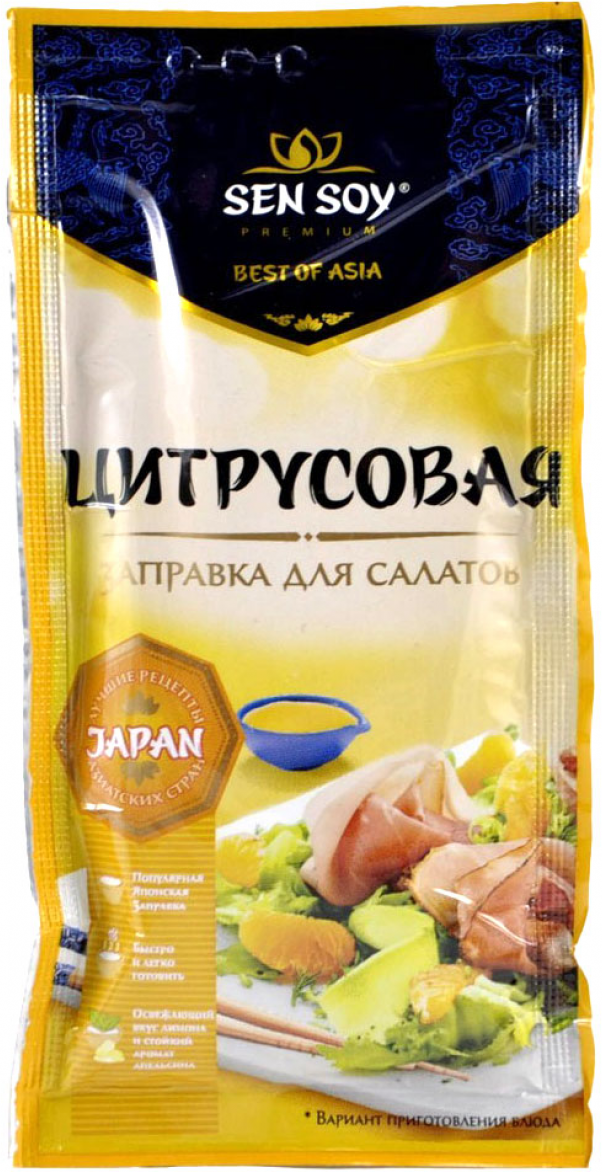 Готовая заправка для салатов. Цитрусовая заправка от "Sen Soy Premium " оживит любой салат, но особенно хороша в салатах из свежих овощей с добавлением курицы, рыбы или морепродуктов. Аромат солнечного апельсина, лимона и пряных специй задают настроение легкому салатному соусу и наполняют блюдо яркими оттенками вкуса.