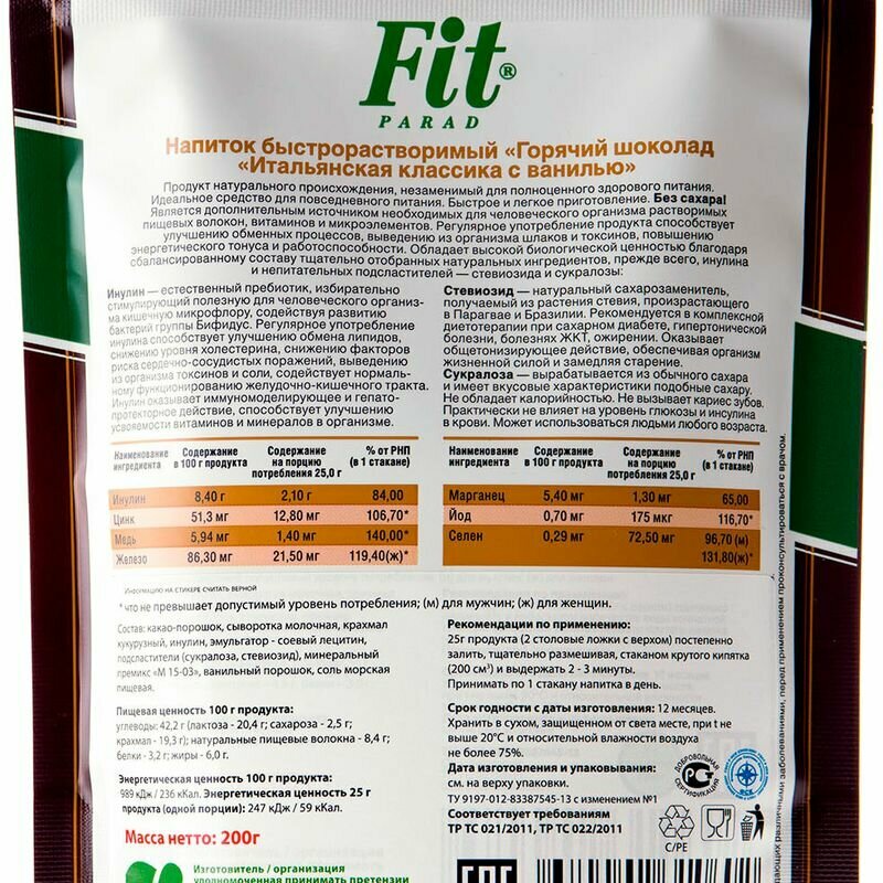 Напиток растворимый Fit Parad Горячий шоколад Итальянская классика с ванилью 200г ПИТЭКО