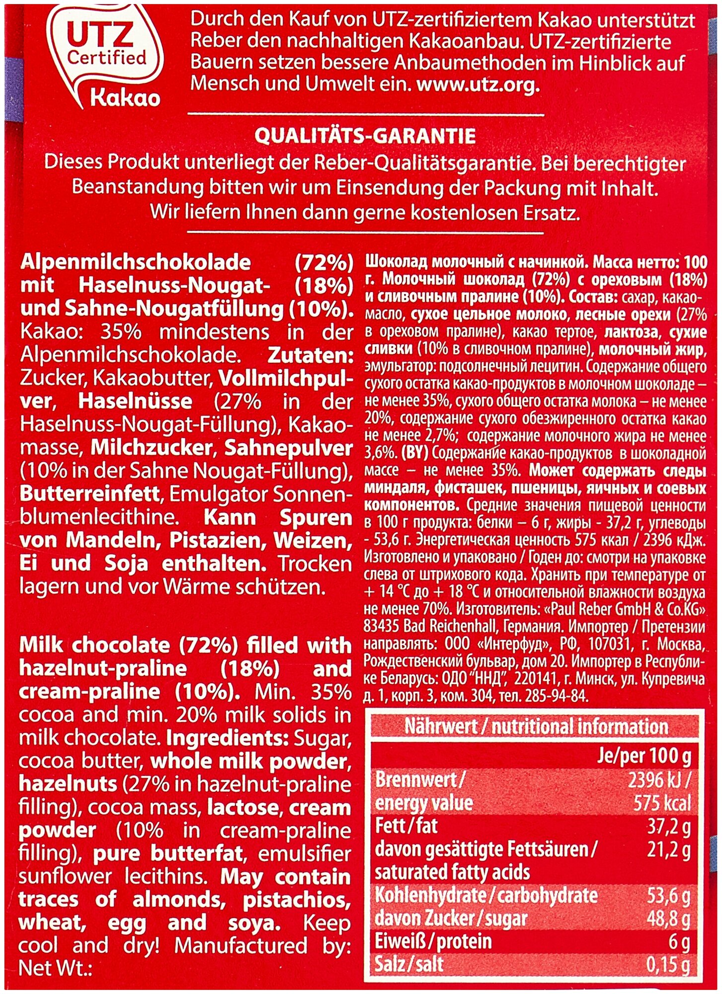 | Состав | Сахар, какао-масло, сухое цельное молоко, лесные орехи (27% в ореховом пралине), какао масса, лактоза, сухие сливки (10% в сливочном пралине), молочный жир, эмульгатор подсолнечный лецитин. Может содержать следы миндаля, фисташек и яичных, соевых компонентов |