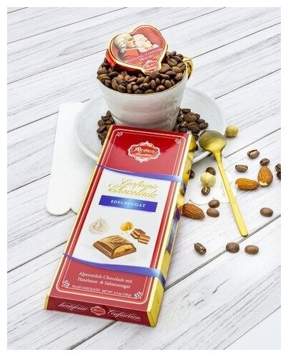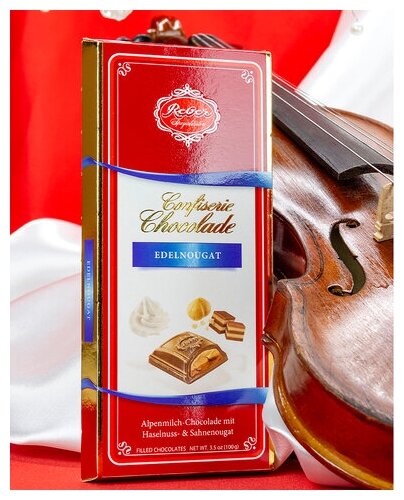 Шоколад Reber Confiserie Edelnougat молочный с ореховым пралине 100г производится в Германии и относится к десертам премиального качества. Тонкий хрустящий корпус из молочного шоколада наполнен двухслойной начинкой из двух видов пралине: сливочно-орехового и шоколадно-орехового. Для приготовления изысканного десерта для настоящих гурманов используется старинный семейный рецепт Петера Ребера и высококачественное сырье: отборные какао-бобы, левантийский фундук из Средиземноморского региона, сливки из альпийского молока. Продукт не содержит консервантов, искусственных красителей и ароматизаторов, пальмового масла и ГМО.