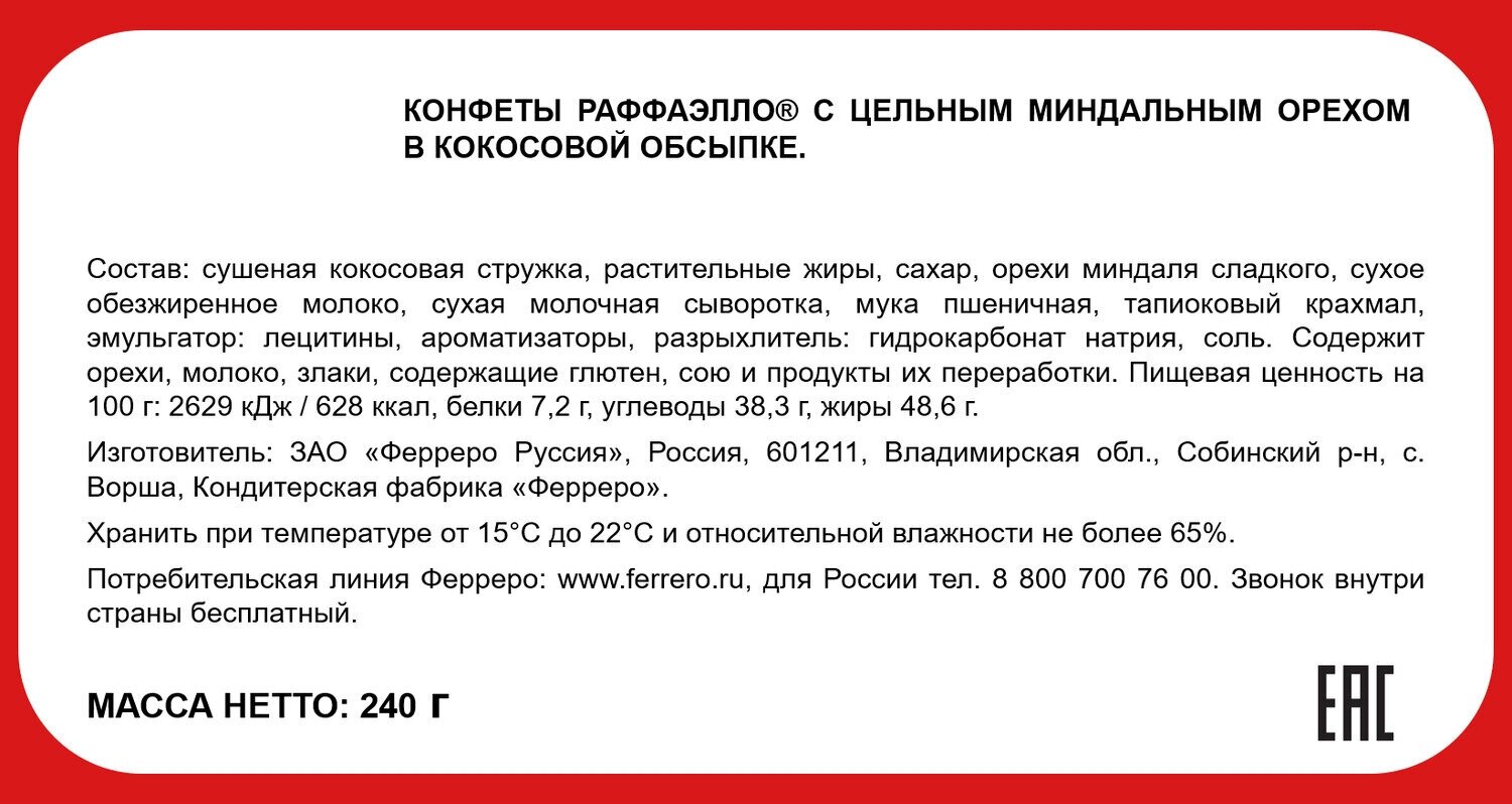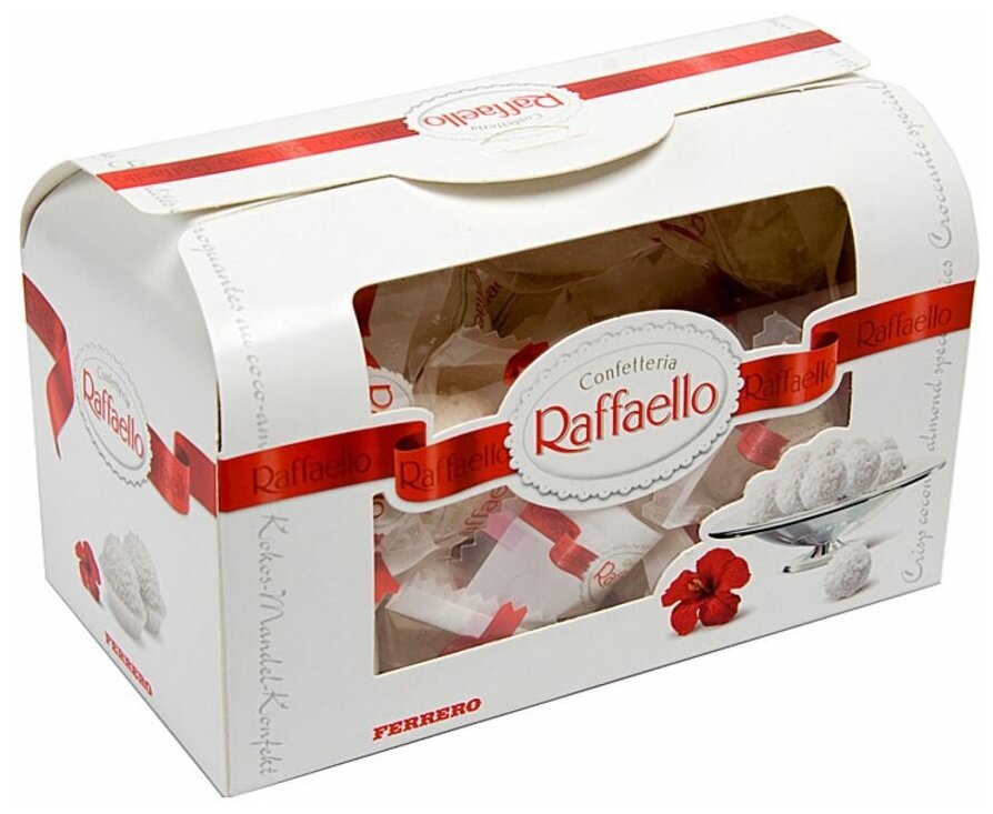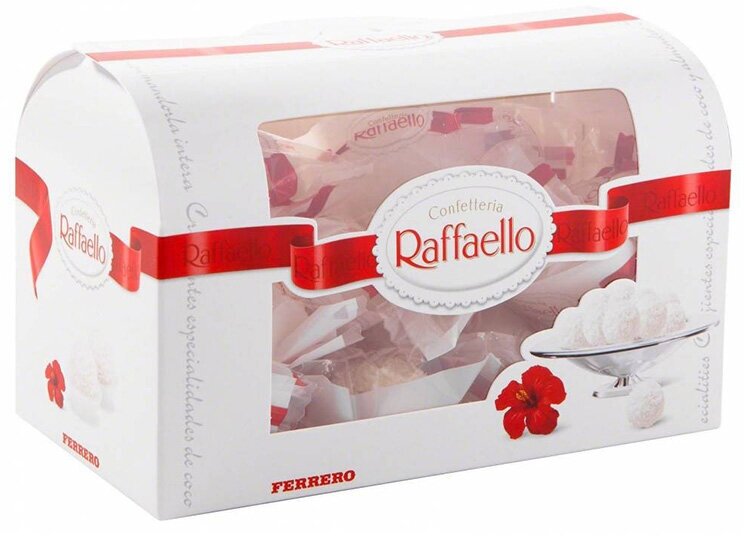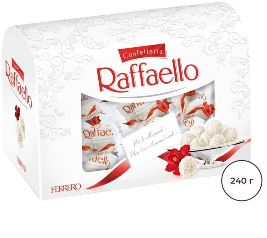 Конфеты Raffaello с цельным миндальным орехом в кокосовой обсыпке 240г - знаменитое лакомство, созданное по оригинальному рецепту кондитеров Ferrero. Оболочка из хрустящей вафли, нежный молочный крем, целый миндаль и ароматная кокосовая стружка - это изысканное сочетание вот уже 25 лет пользуется огромной популярностью во всем мире. Raffaello были созданы как "летние" конфеты, которые в отличие от шоколадных не тают при высокой температуре. Каждое изделие упаковано в индивидуальный пакетик. Картонный сундучок с прозрачными окошками оформлен в фирменном стиле.