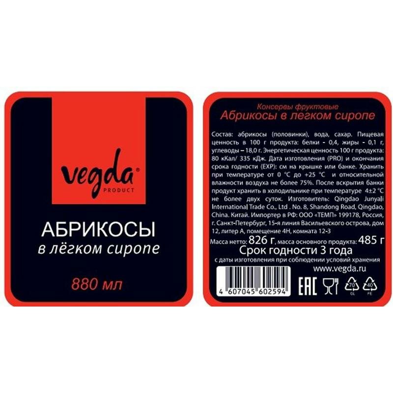 Абрикосы Vegda в легком сиропе 880мл Qingdao Junyali
