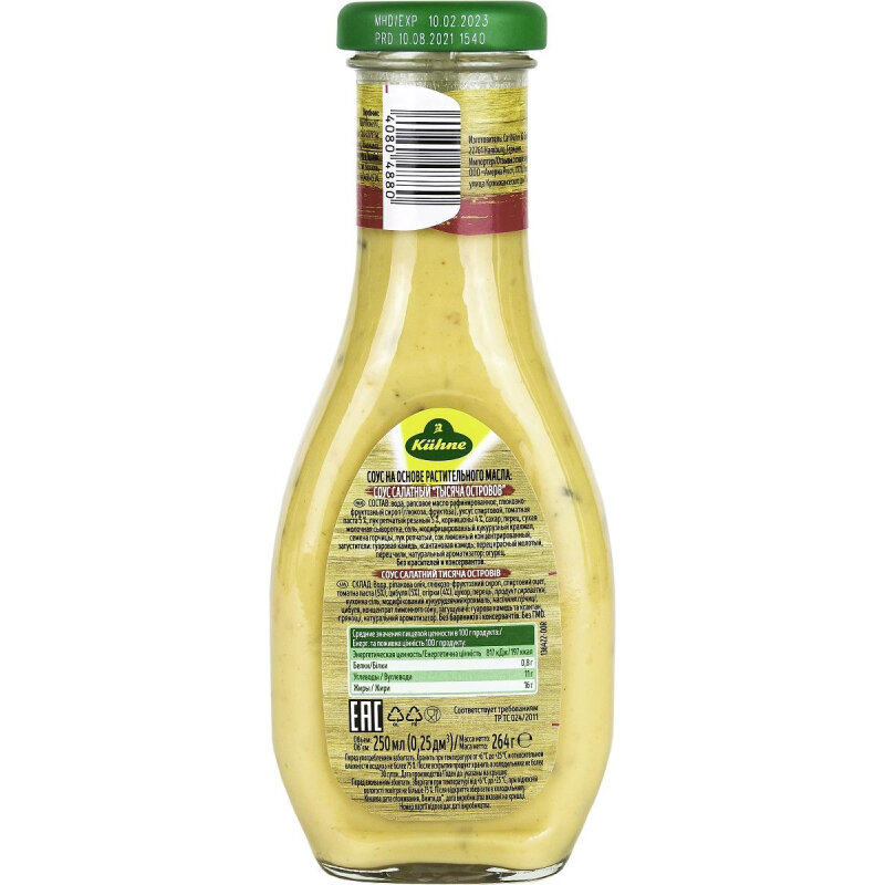 Соус Kuhne Тысяча островов салатный 250мл - пикантный соус на основе растительного масла, томатов, огурцов и целого букета душистых специй. Особую изюминку ему придают нарезанные мелкими кусочками овощи (красный и зеленый болгарский перец, корнишоны), а семена горчицы, лук и чеснок делают вкус более насыщенным и пряным. Традиционно подается с салатами, как приправа для сэндвичей и гамбургеров (особенно в американской и канадской кухнях), с рыбой, креветками и другими морепродуктам. Не содержит консервантов и ГМО.