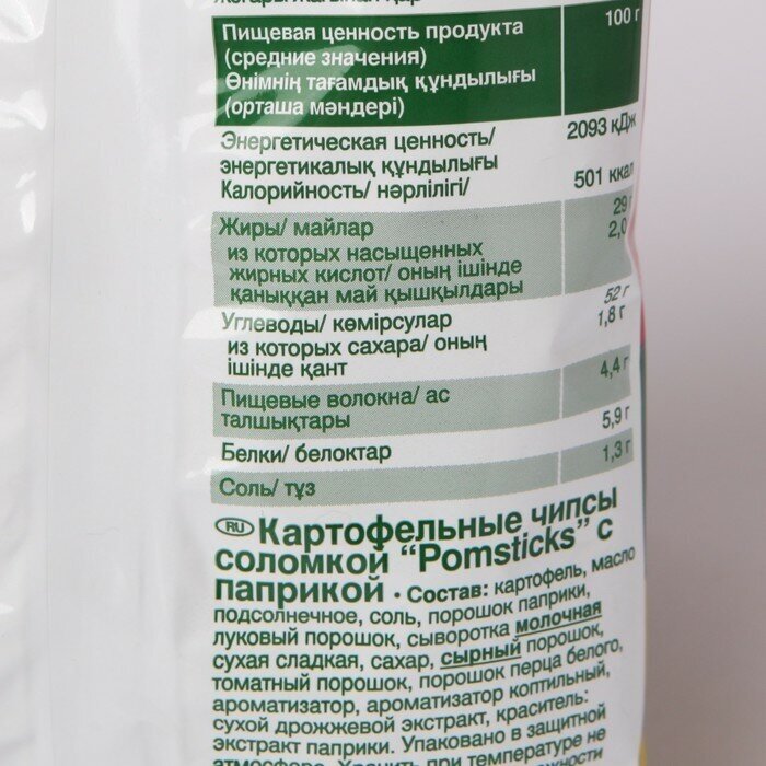 | Состав | картофель, масло пальмовое, вкусо-ароматическая добавка "паприка" (соль поваренная пищевая, сухая молочная сыворотка, ароматизатор, ароматизатор коптильный, сахар, порошок паприки, луковый порошок, сырный порошок, томатный порошок, краситель |