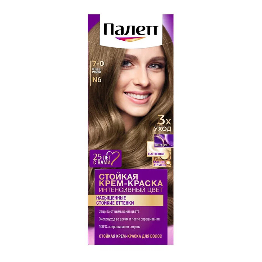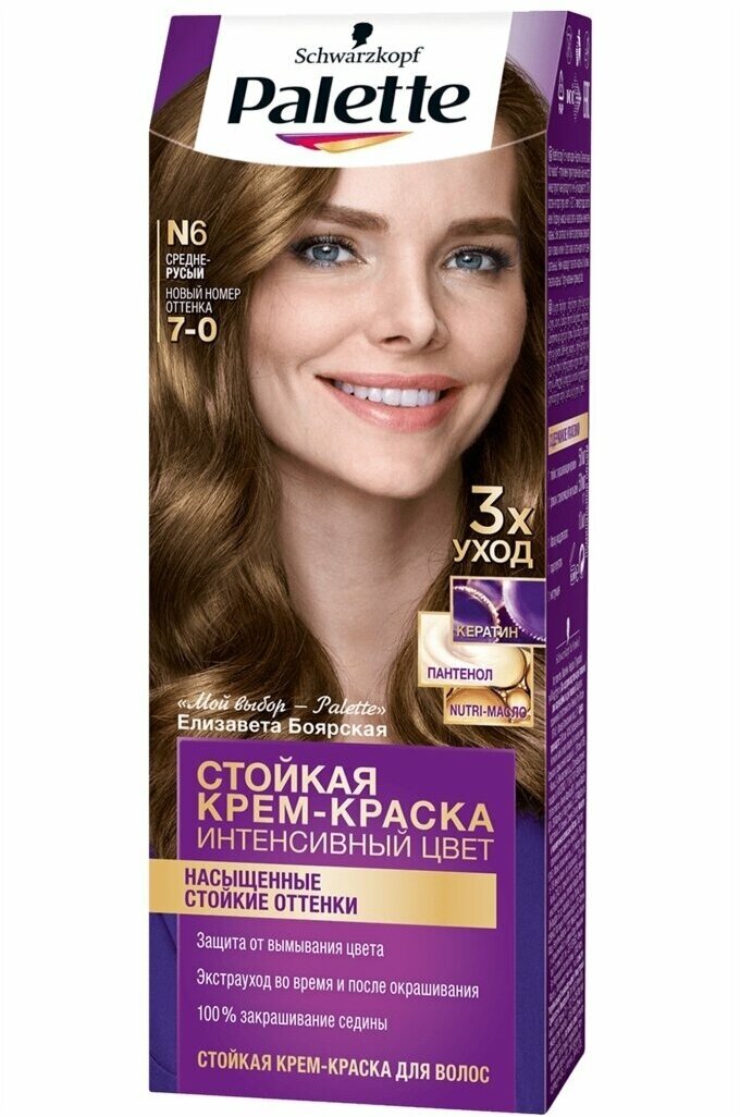 Крем-краска для волос Palette N6 Средне-русый - это стойкая крем-краска, обогащенная улучшенным Кератин-Комплексом для интенсивного и сияющего цвета. Она проникает в структуру волоса и фиксирует пигменты, обеспечивающие глубокий насыщенный цвет, 100% закрашивание седины и ослепительный блеск. Специальная маска ухаживает за волосами и защищает интенсивность цвета в течение длительного времени. Для длинных и густых волос следует приобретать 2 упаковки. Оттенок N6 Средне-русый рекомендуется использовать для волос от светло-русого до темно-русого цветов. В набор входит окрашивающий крем, проявляющая эмульсия, маска-уход после окрашивания, перчатки и инструкция.