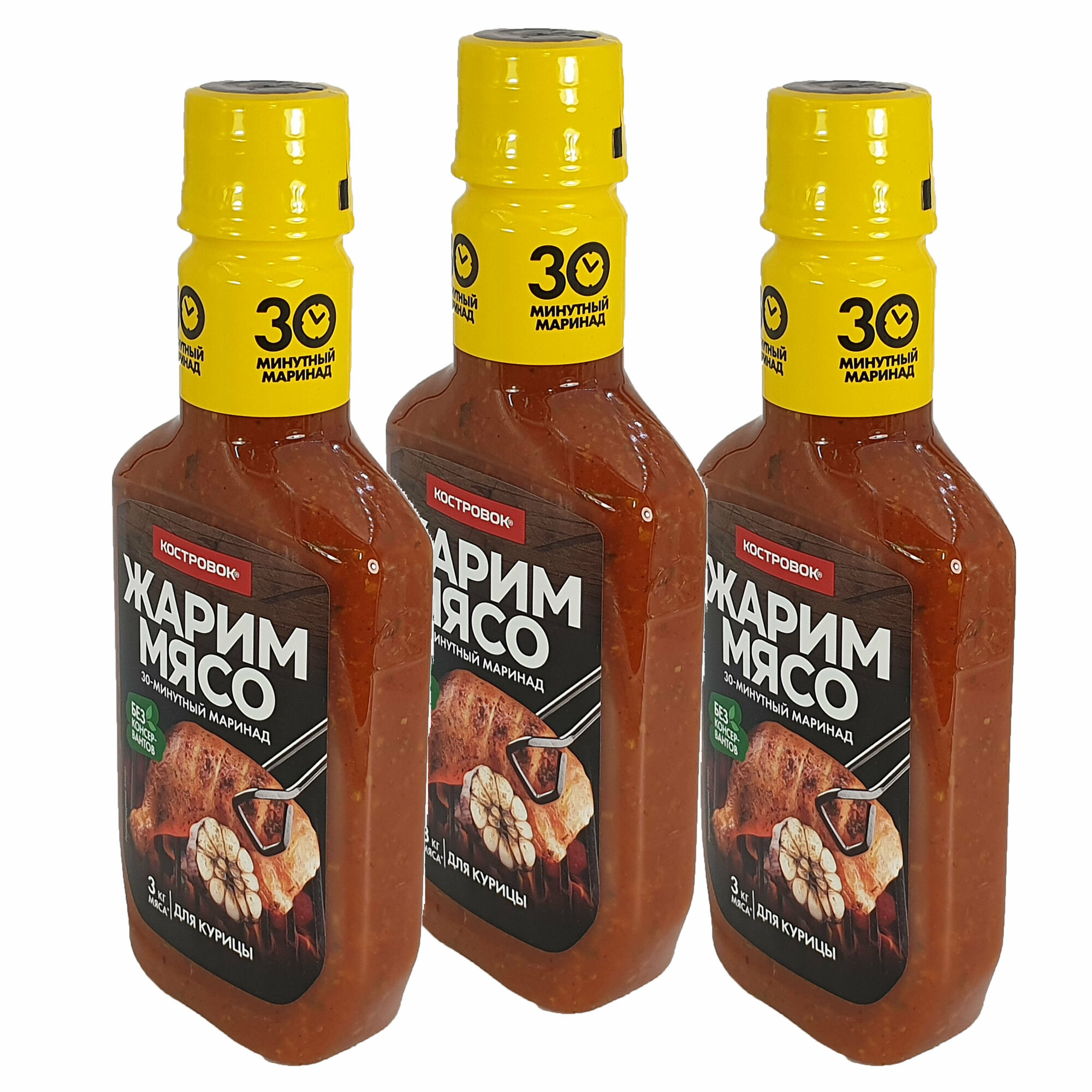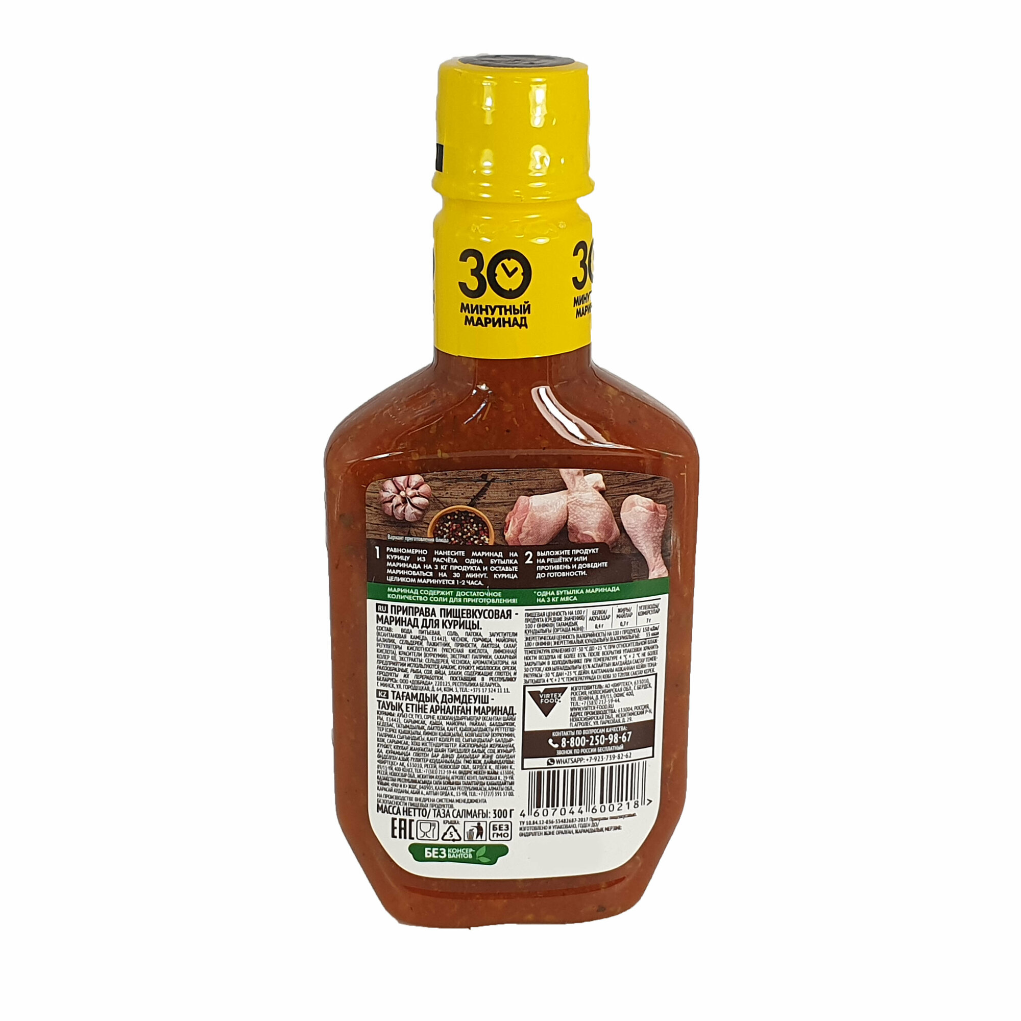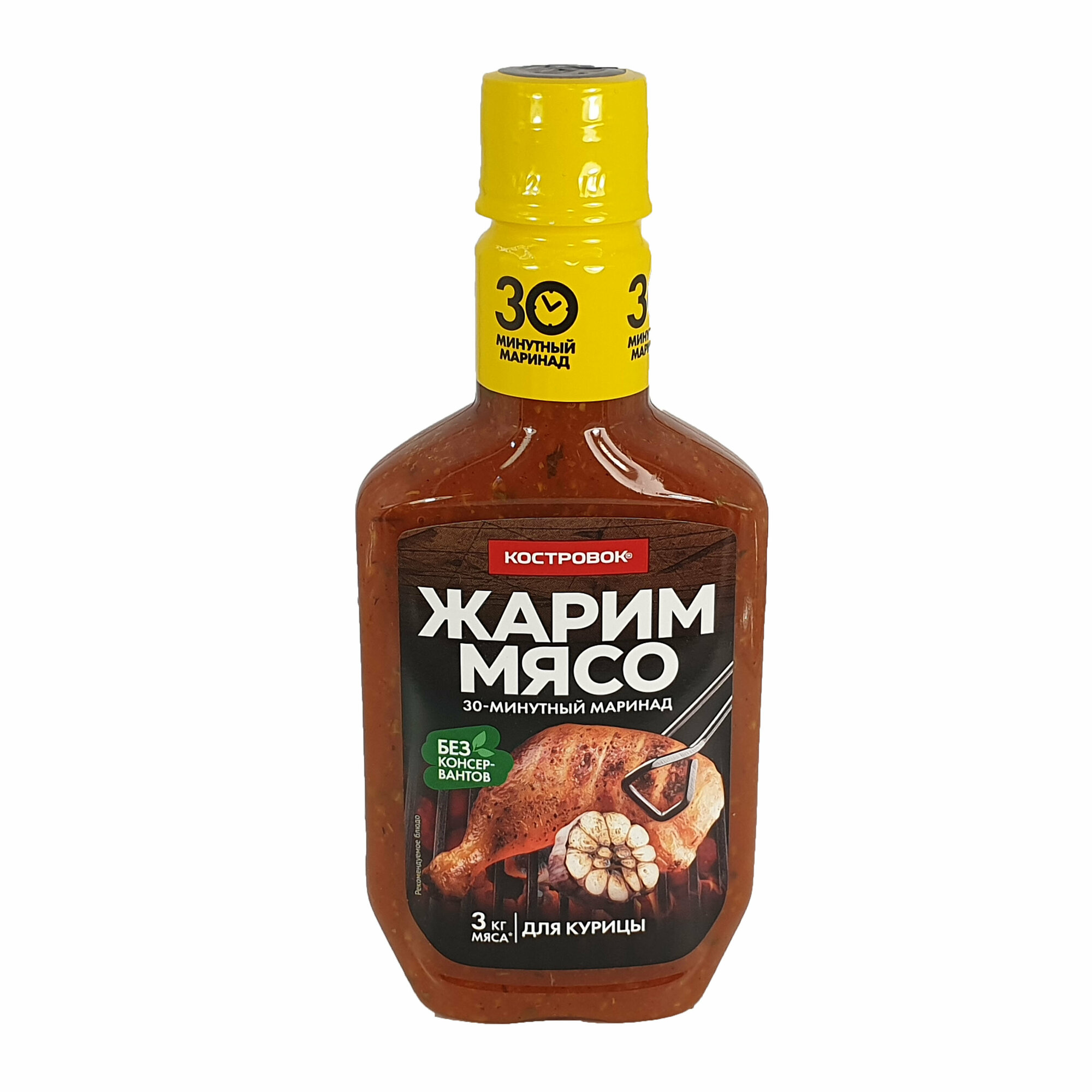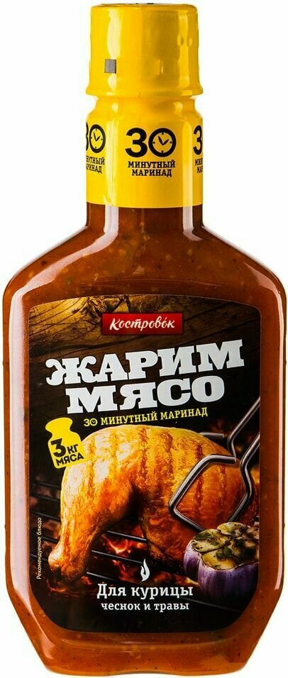 Маринад Костровок для курицы 300г – идеальное решение для приготовления аппетитных блюд (в том числе шашлыка) из куриного мяса. Содержит оптимальное количество специй, пряностей, трав и кислот, которые помогут размягчить курицу и придать ей поистине восхитительный вкус с деликатными пикантными нотками. Одна бутылка рассчитана на 3 кг мяса, а этого будет достаточно, чтобы накормить даже большую компанию! Равномерно нанесите маринад на кусочки курицы и оставьте на 30 минут. Продукт может также использоваться для маринования целой куриной тушки, но при этом время воздействия необходимо увеличить до 1-2 часов. Замаринованное мясо можно запечь в духовом шкафу или на мангале, обжарить на сковороде или на гриле. При любом способе приготовления курочка получится сочной, нежной, ароматной и очень вкусной.