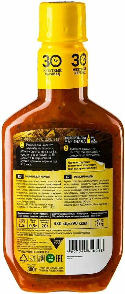 | Состав | Вода, соль, патока, чеснок, перец красный, перец черный, майоран, базилик, карри, сельдерей, загустители - крахмал кукурузный модифицированный, камедь ксантановая; ароматизаторы в т.ч. натуральные, красители натуральные - куркумин, экстракт паприки; регуляторы кислотности - кислота лимонная, кислота уксусная; консерванты - сорбат калия, бензоат натрия. |