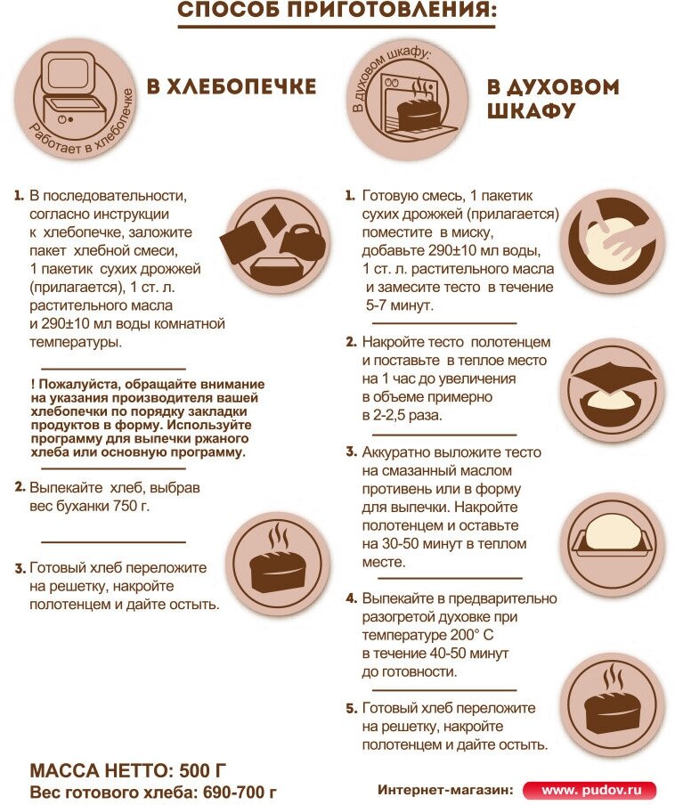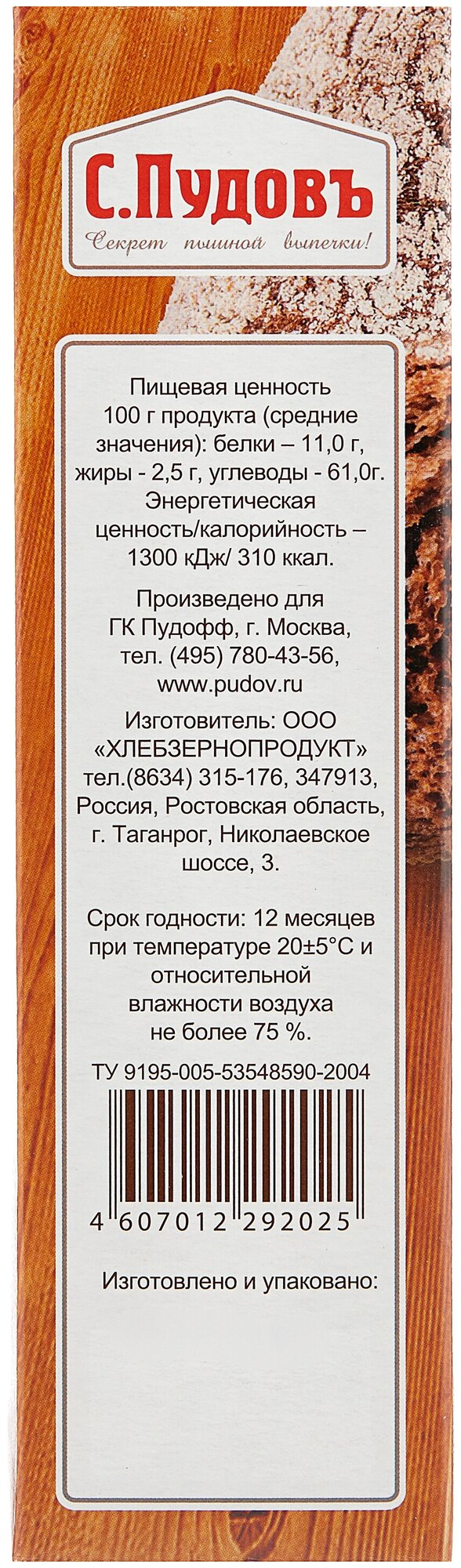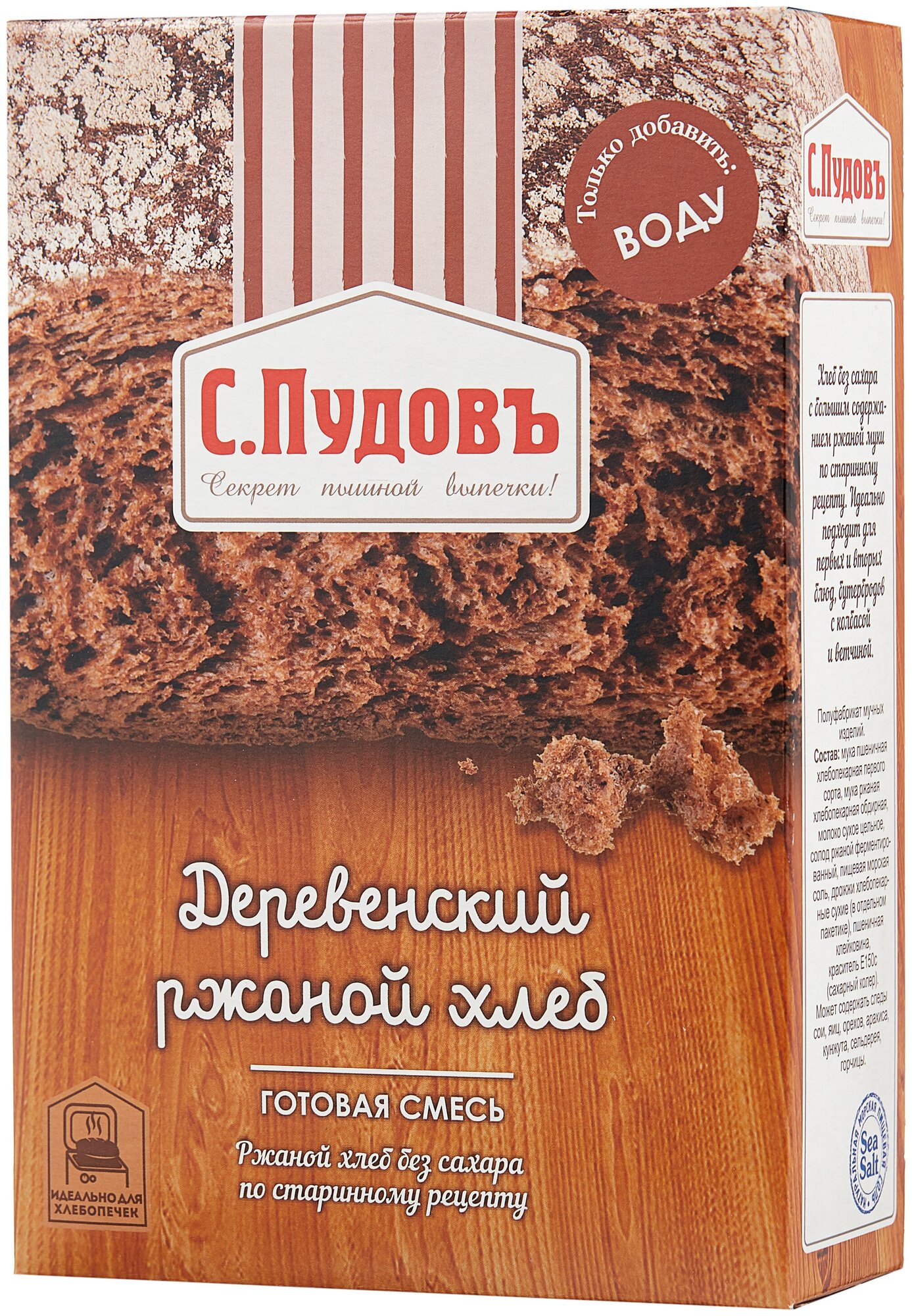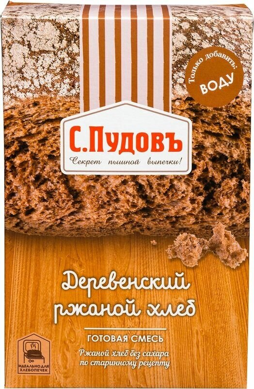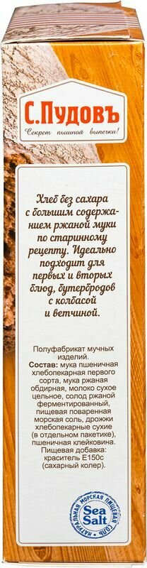 Смесь для выпечки С.Пудовъ Деревенский ржаной хлеб 500г - это готовая смесь для приготовления аппетитного домашнего хлеба по старинному рецепту без сахара и с большим содержанием ржаной муки. Подходит для выпечки в духовке или хлебопечке. Для замешивания теста вам понадобится только вода (в состав уже входит пшеничная мука первого сорта, ржаной солод, морская соль и сухие дрожжи, которые прилагаются в отдельном пакетике). Вес буханки, приготовленной из целой упаковки, составит примерно 650-750 грамм. Продукт не содержит ГМО.