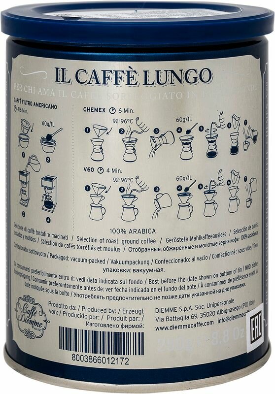 Кофе молотый Caffe Diemme Il Caffe Lungo 250г — изысканный высококачественный молотый кофе для приготовления методом лунго от премиального итальянского бренда. Смесь состоит из двух видов арабики с кофейных плантаций Никарагуа и Сальвадора. Напиток получается очень насыщенным и ярким, имеет цитрусово-цветочный вкус с шоколадно-ореховым оттенком. Для того, чтобы вкус кофе был максимально «правильным», используется легкая обжарка и деликатный помол. Для приготовления этого кофе рекомендуется использовать кофеварки капельного типа, кремекс и пуровер. Вакуумная упаковка, вложенная в стильную жестяную банку, прекрасно сохраняет вкусовые качества арабики для того, чтобы вы всегда могли насладиться чашечкой свежего ароматного бархатного лунго!
